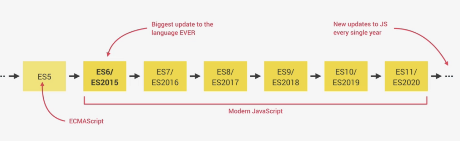 JS는 ECMA international이라는 기구에서 제정한 ECMAScript라는 기술 사양을 준수하는 스크립팅 언어입니다. 그래서 ECMAScript(ES)가 업데이트 될 때마다 JS또한 업데이트된다고 보시면 됩니다. ES6(ES2015)를 기준으로 JS의 대격변 업데이트가 진행되었고, 이 이후의 JS버전을 Modern JavaScript라고 부릅니다.