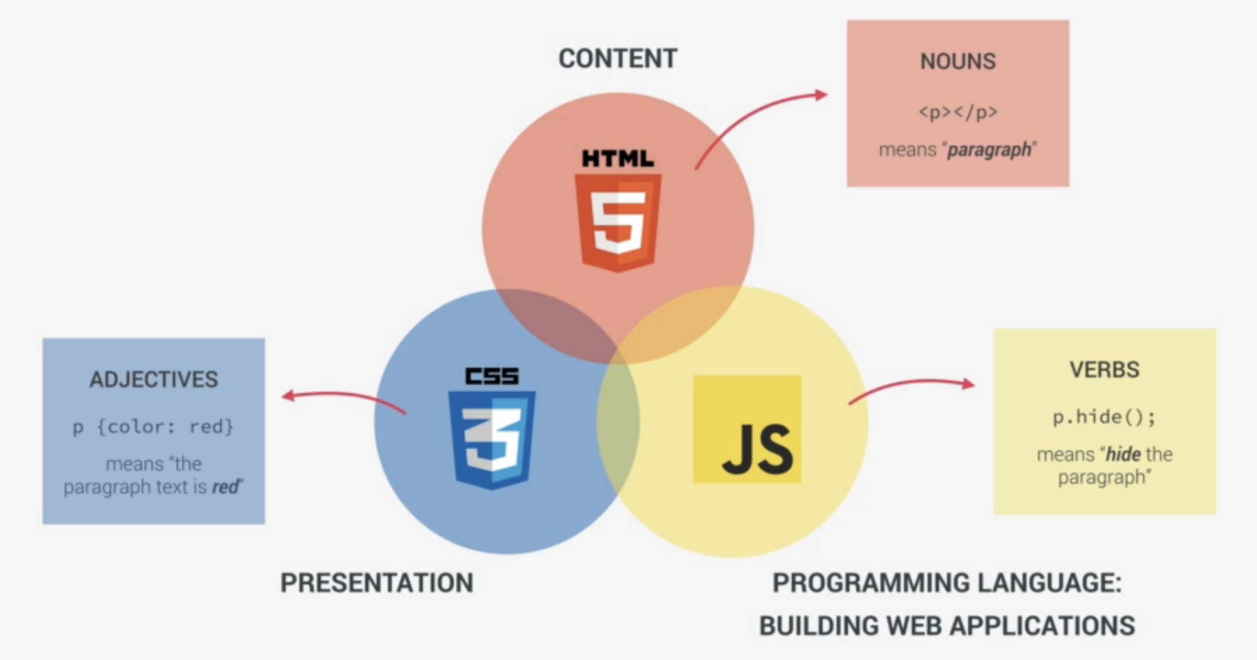 JS: 동적이고 인터랙티브한 효과를 페이지에 추가합니다. 서버로부터 데이터를 맏아오기도 하고 웹 앱을 제작하기도 합니다. 흔히 말하는 반응형 페이지는 JS로 만들어집니다.