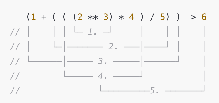 5. 비교 연산자는 수학 연산자보다 우선순위가 낮습니다. 그래서 '>'를 기준으로 좌항의 수학 연산이 모두 완료된 뒤에 비교 연산이 시작됩니다.