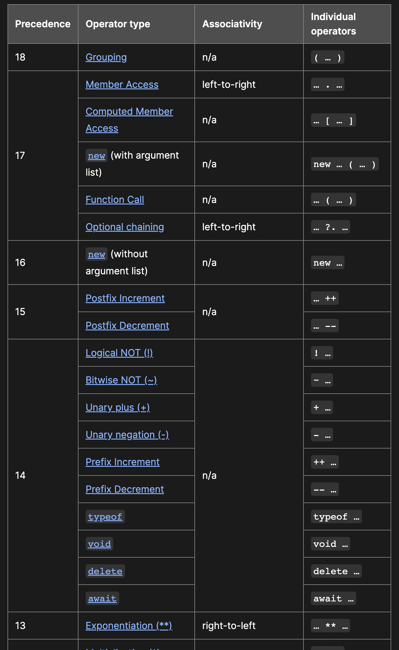 우선순위 표 링크 : https://developer.mozilla.org/ko/docs/Web/JavaScript/Reference/Operators/Operator_Precedence#%ED%91%9C