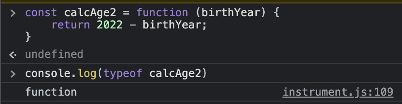 위의 예제 코드를 보시면, 함수가 expression이 되어서 calcAge2에 저장됩니다. 그리고 calcAge2는 함수가 됩니다.