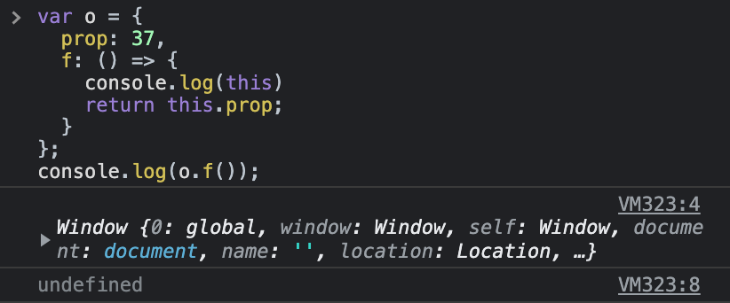 일반함수에서 화살표함수로 변경후 this 키워드가 객체 o를 가리키는 것이 아니라 객체 o의 상위 스코프인 전역 객체(window)를 가리키고 있습니다. 결국 화살표함수로 선언된 메소드 f()는 window 객체에서 'prop'을 찾지 못한 채 undefined를 return 합니다.