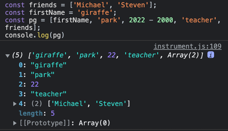 const pg = [firstName, 'park', 2022 - 2000, 'teacher', friends];