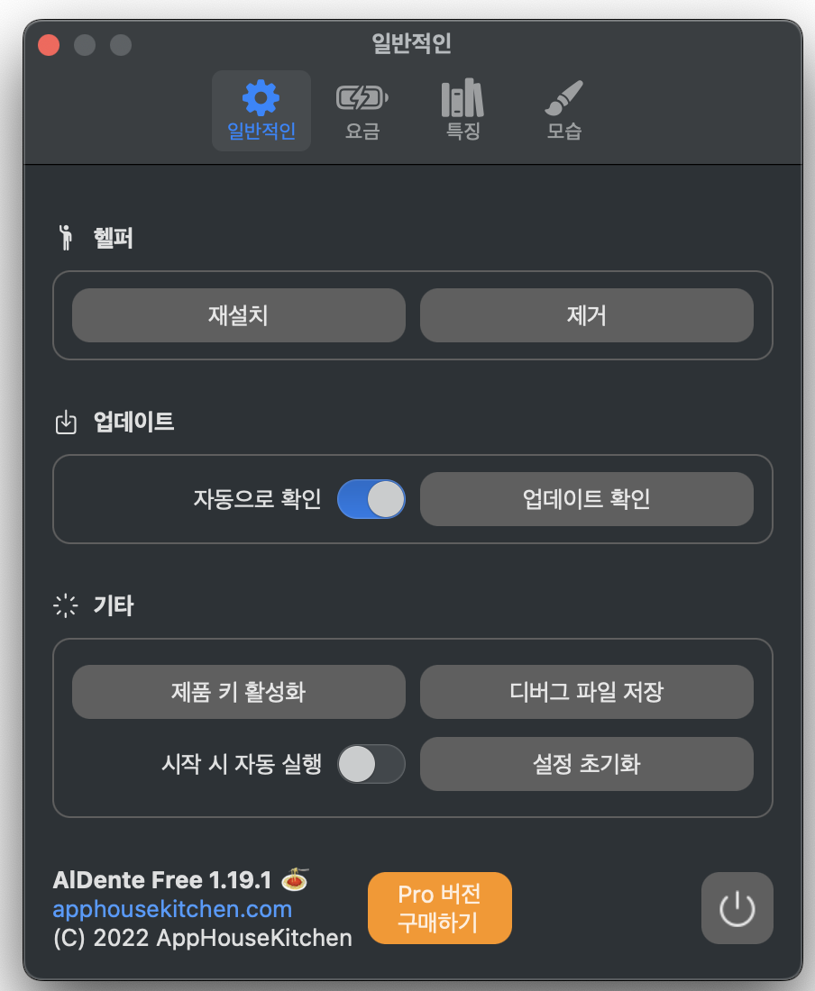 AlDente는 기본적으로 무료 프로그램입니다. 하지만 추가 기능은 pro 요금제를 구매해야 합니다.