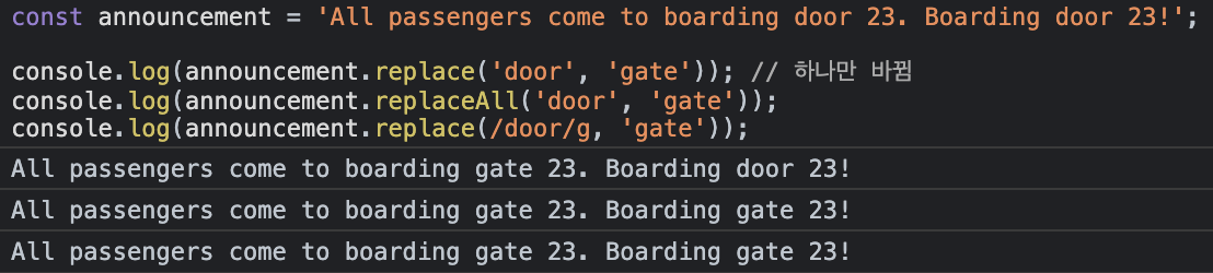 console.log(announcement.replace('door', 'gate')); // 하나만 바뀜