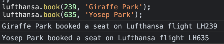 위의 예제 코드는 lufthansa 항공에 대한 정보가 담긴 property와, 예약을 할 수 있는 book 메소드가 담겨 있습니다.