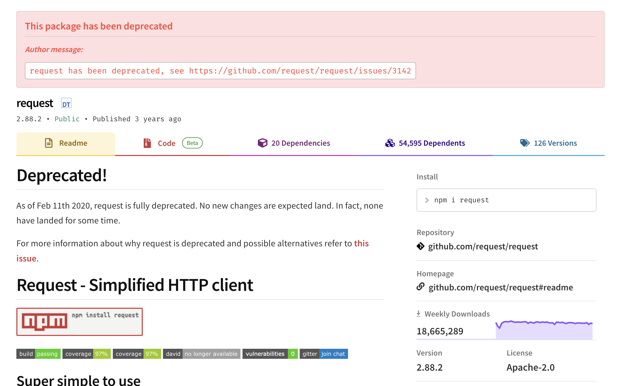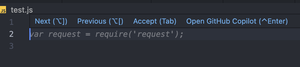 Request 모듈은 공식적으로 지원 중단된 모듈입니다. 현대 자바스크립트의 업데이트에 따라 필요가 없어졌기 때문입니다. 근데 코파일럿은 그대로 추천을 해줍니다. 코파일럿이 추천해주는 코드는 깃허브에 다른 사람이 올려 놓은 코드를 기반으로 추천해주는 것입니다. 구식 코드들을 코파일럿이 읽고 추천해줄 수도 있습니다.