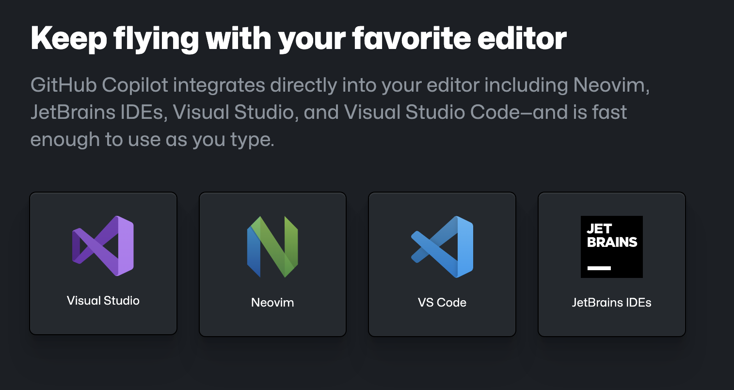 공식사이트에서는 Visual Studio, Neovim, VS Code, JetBrains IDEs에서 코파일럿을 사용할 수 있다고 하는데, 일단 VS Code에서만 사용해보겠습니다.