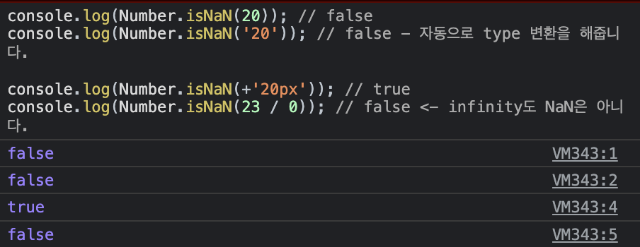 console.log(Numbmer.isNaN('20')); // false - 자동으로 type 변환을 해줍니다.