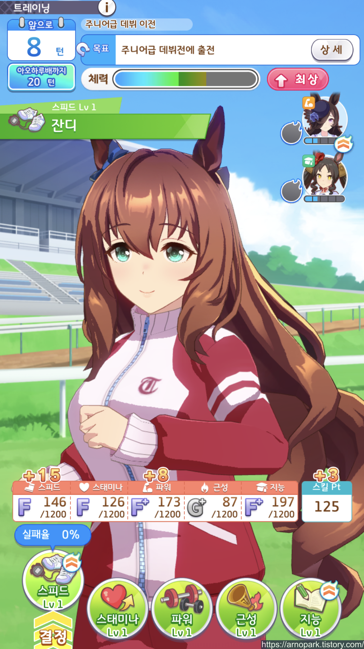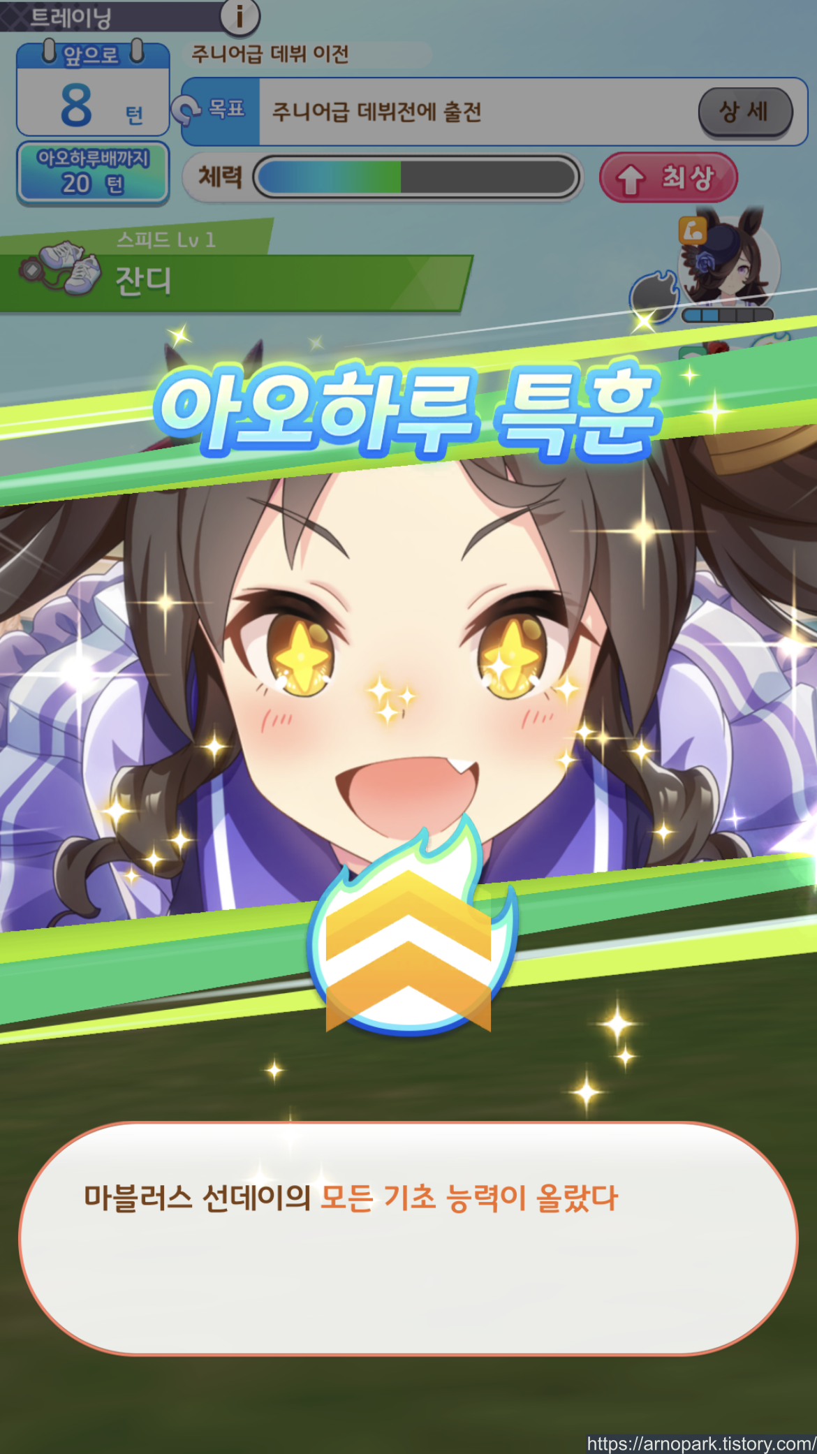 아우하루 특훈 상태는 서포터 우마무스메 우측 상단의 화살표 마크를 통해서 가능합니다.