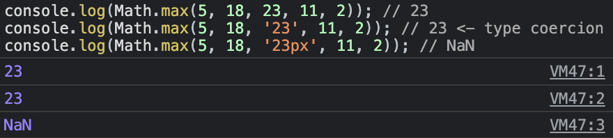 console.log(Math.max(5, 18, '23', 11, 2)); // 23 <- type coercion