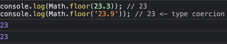 console.log(Math.floor('23.9')); // 23 <- type coercion
