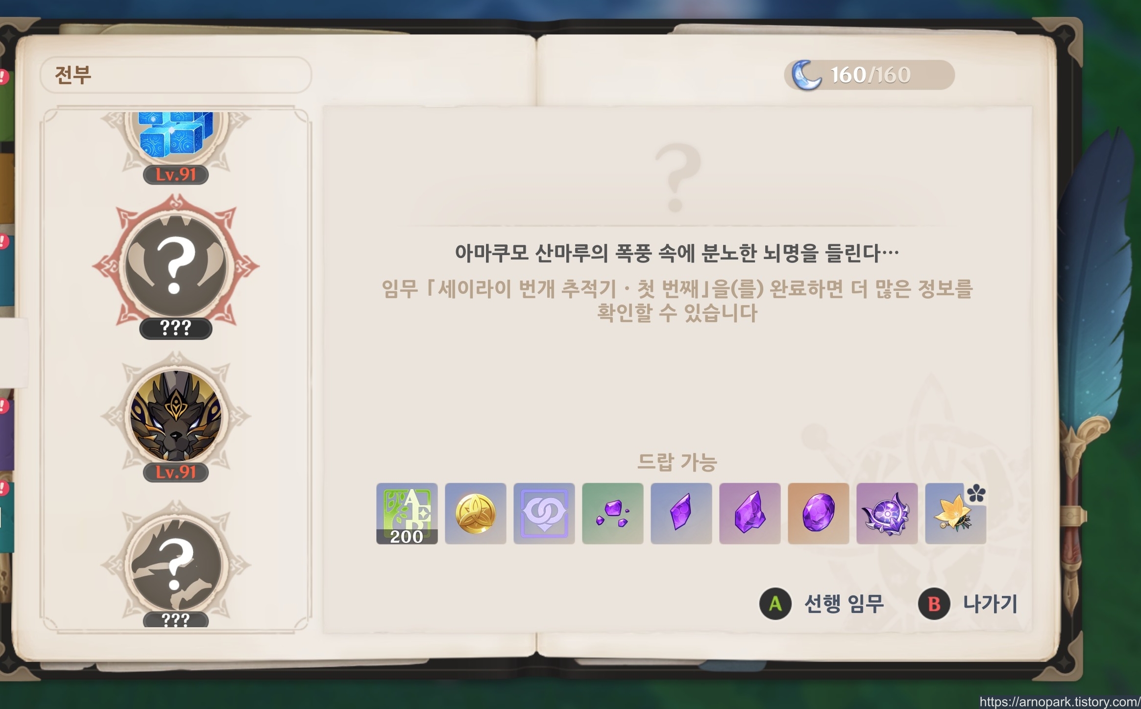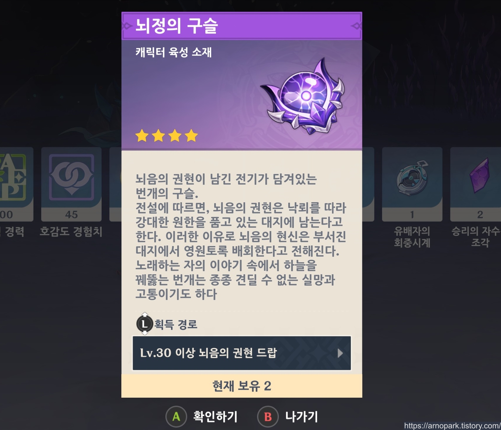 라이덴 쇼군의 레벨업 돌파 소재 중에 '뇌정의 구슬'이 있습니다. 뇌정의 구슬은 특정 보스를 잡아야 얻을 수 있는데, 그 보스를 만나려면 좀 번거로운 퀘스트를 깨야 합니다.