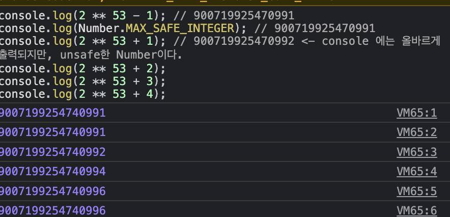 console.log(2 ** 53 + 1); // 900719925470992 <- console 에는 올바르게 출력되지만, unsafe한 Number이다.