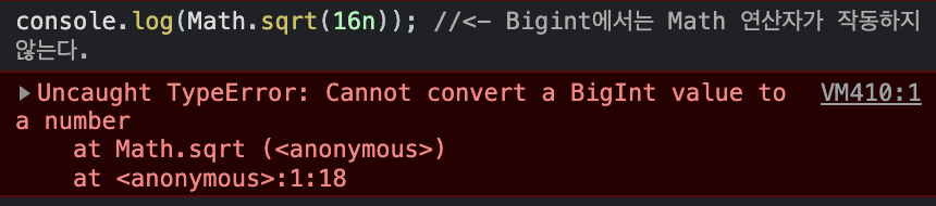 console.log(Math.sqrt(16n)); // <- Bigint에서는 Math 연산자가 작동하지 않는다.