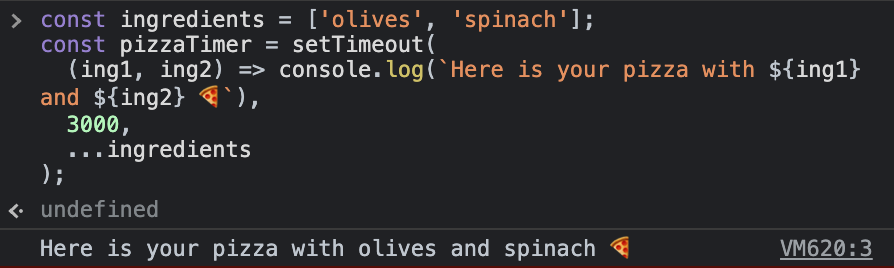 (ing1, ing2) => console.log(`Here is your pizza with ${ing1} and ${ing2} 🍕`),