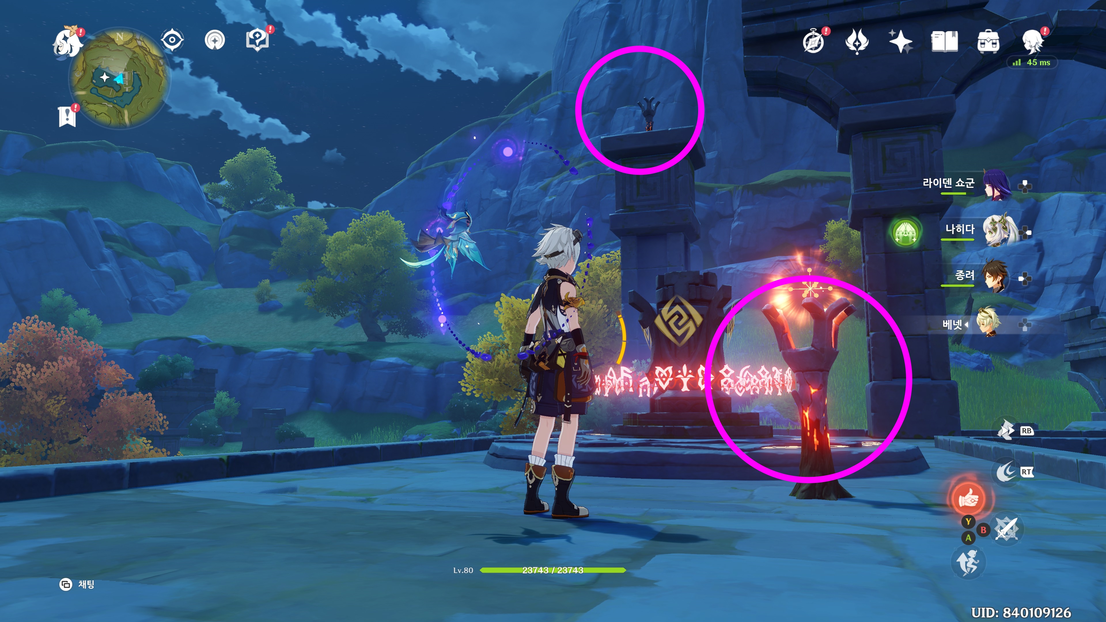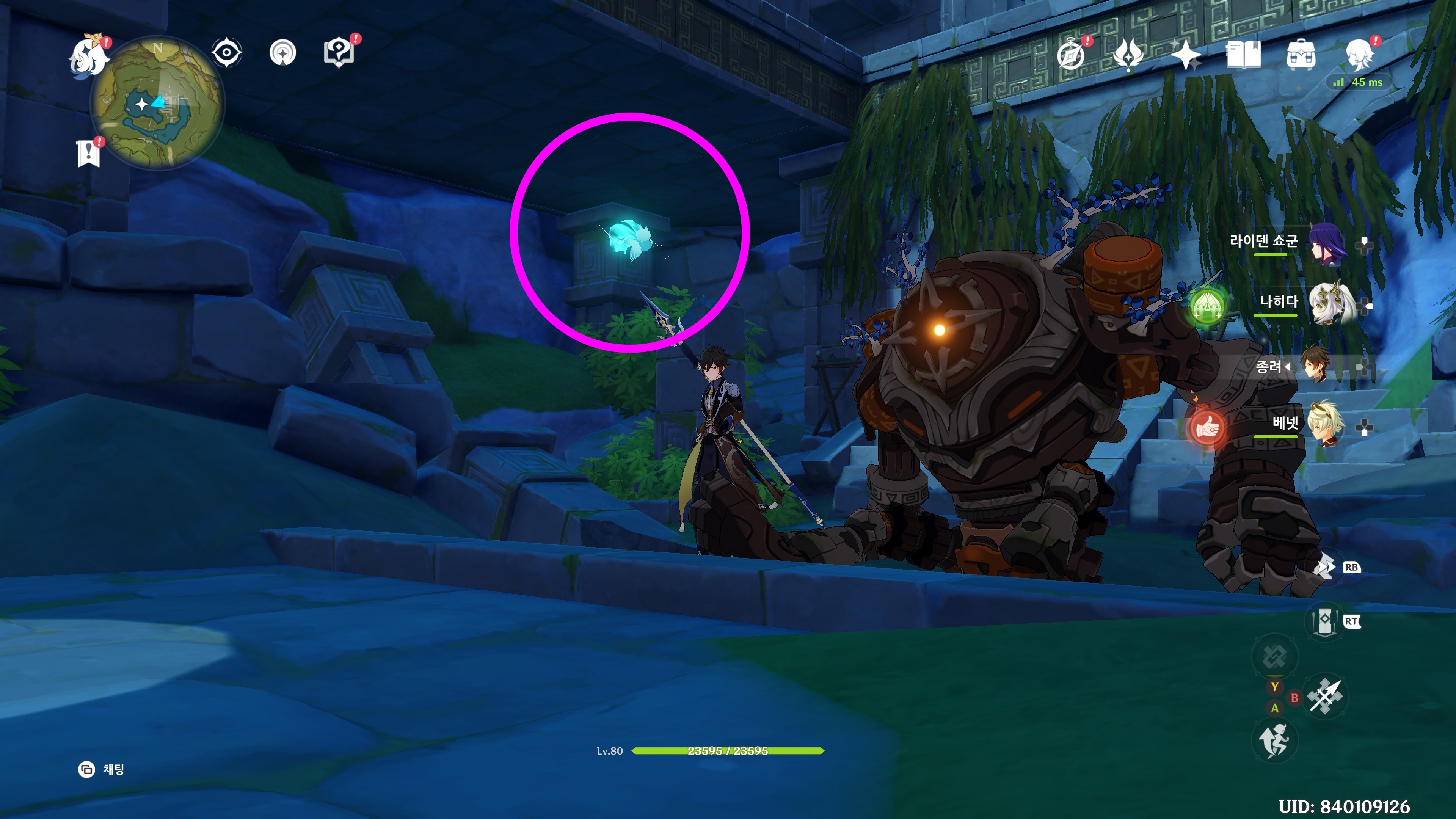 두 번째 기믹은 3마리의 선령을 모으는 것입니다. 바로 첫 번째 선령은 바위 원소 석상 뒤에 있습니다.