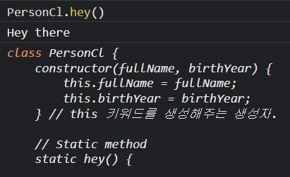 PersonCl이라는 클래스 이름에 바로 hey() 메소드를 사용합니다. 그러면 정상적으로 작동합니다.