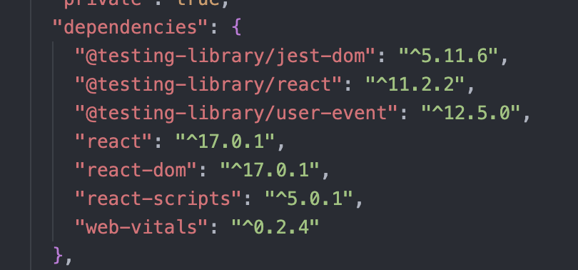 create-react-app으로 만든 리액트 앱의 package.json을 가면, 위의 사진처럼 react, react-dom이라는 모듈을 확인할 수 있습니다. 이 두 모듈을 통해서 JSX라는 syntax sugar를 사용할 수 있게 됩니다.