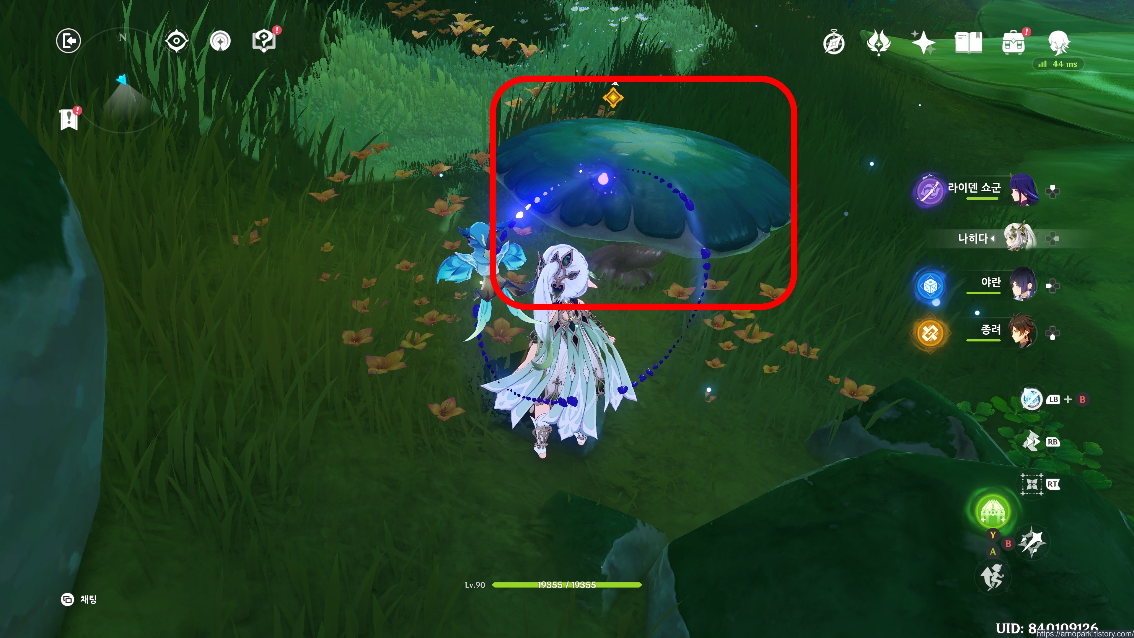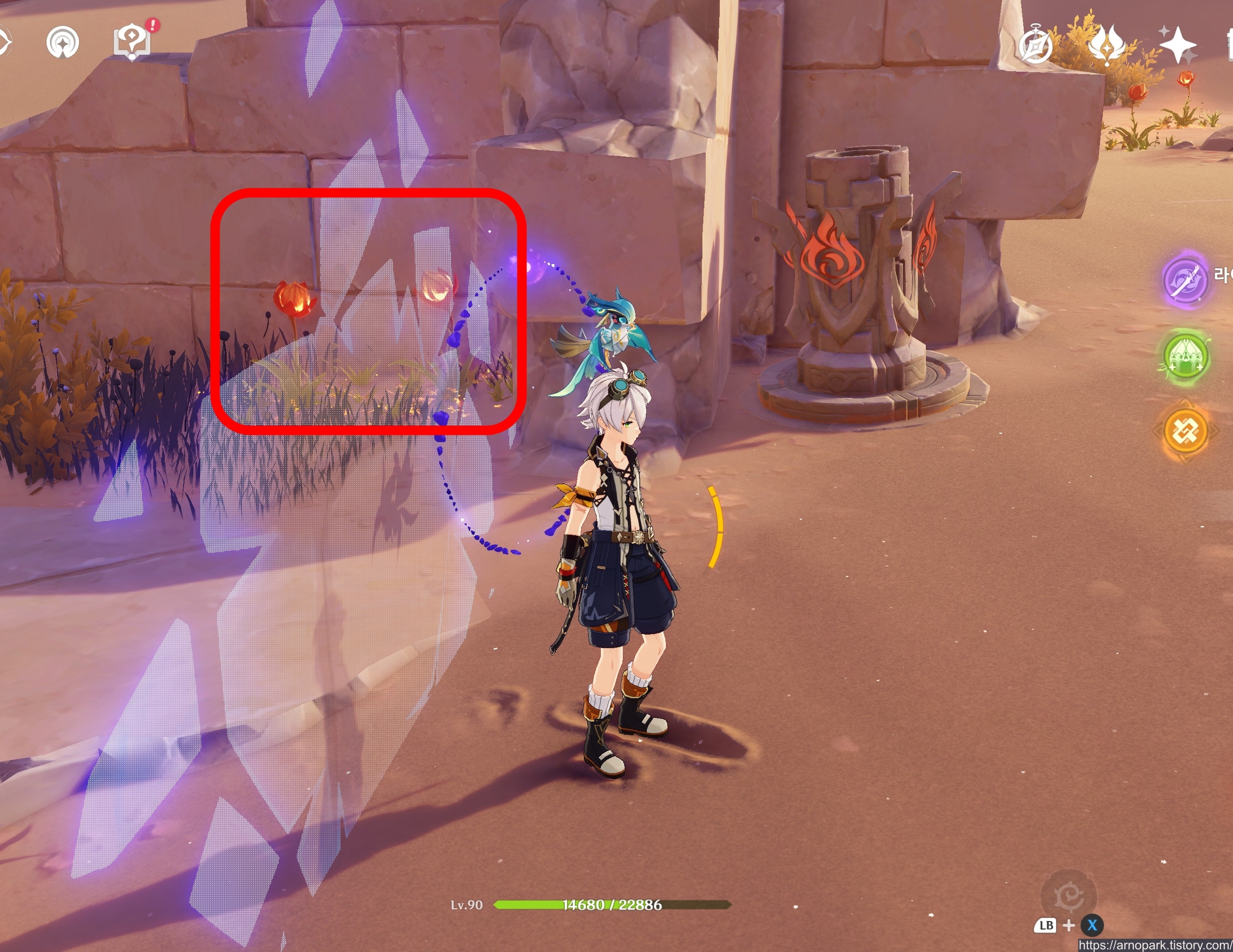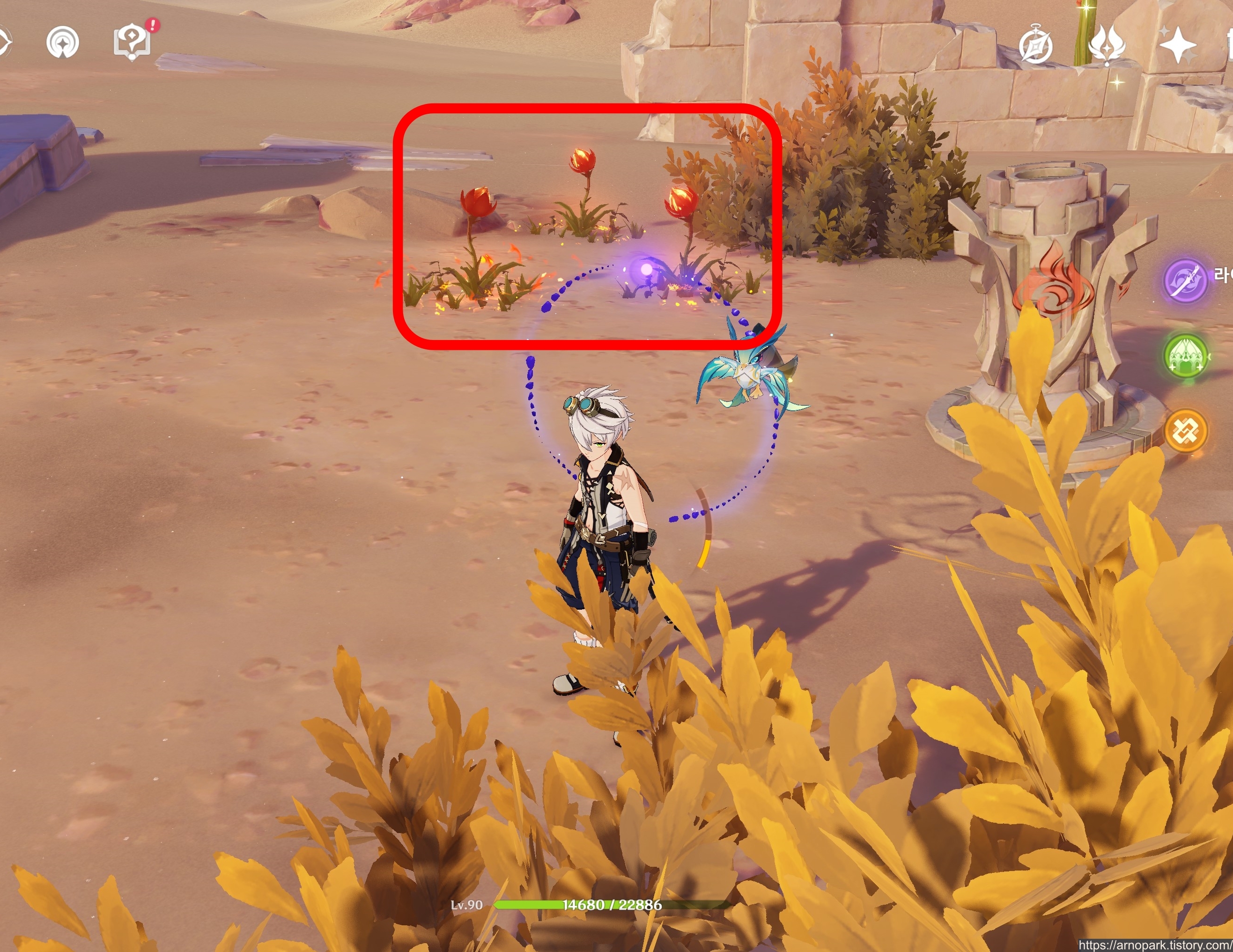 도전 버섯이 있는데, 도전을 시작하기 전에 사진의 네모 부분에 위치한 식물을 풀 원소 스킬로 때려줍니다.