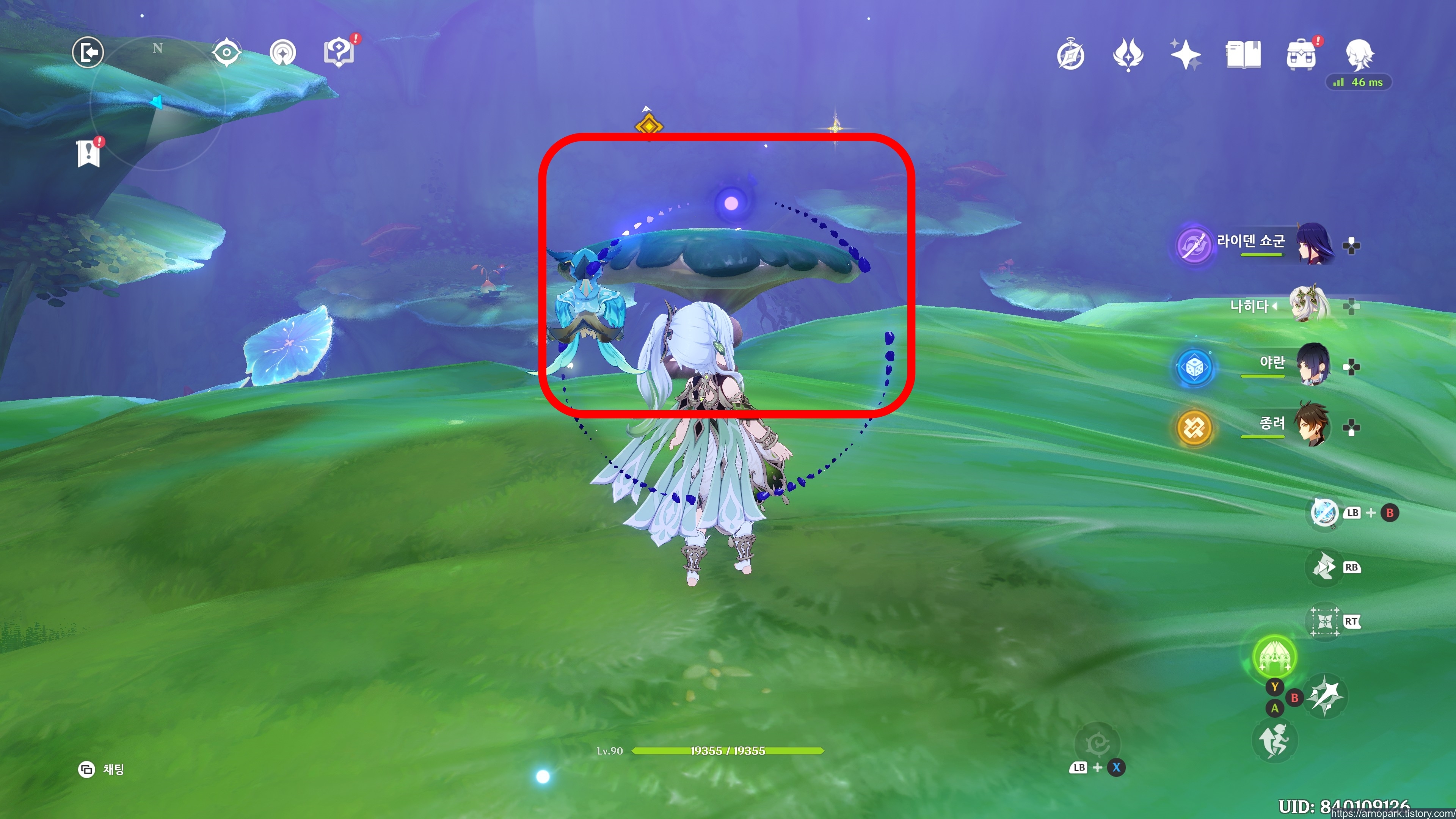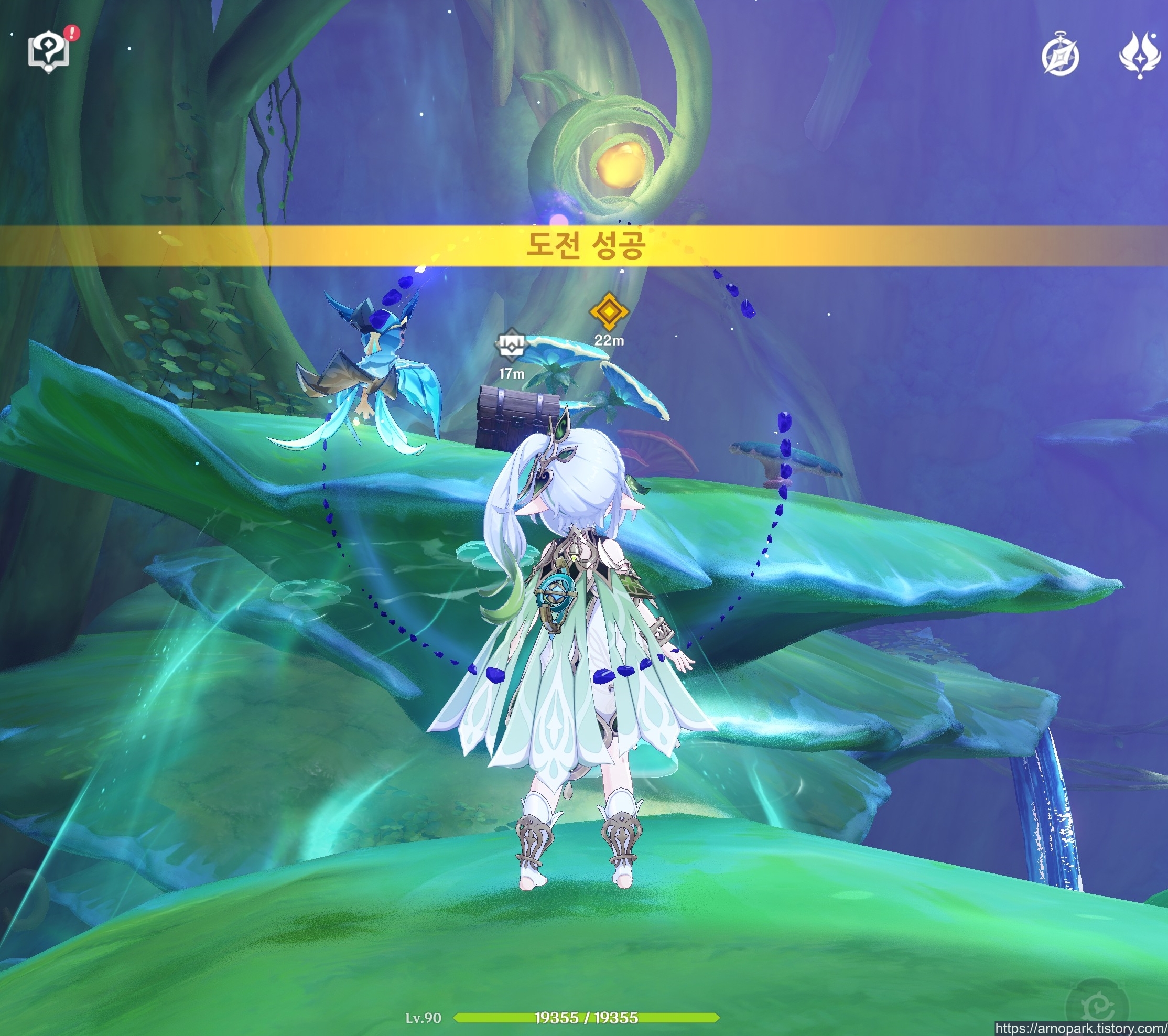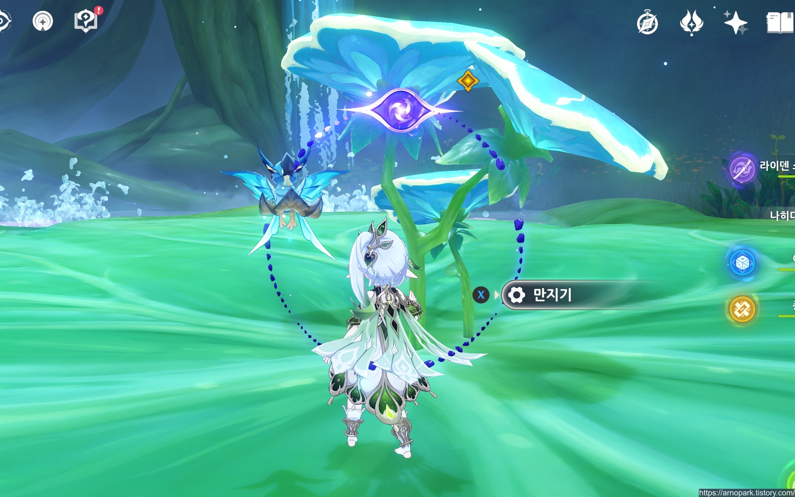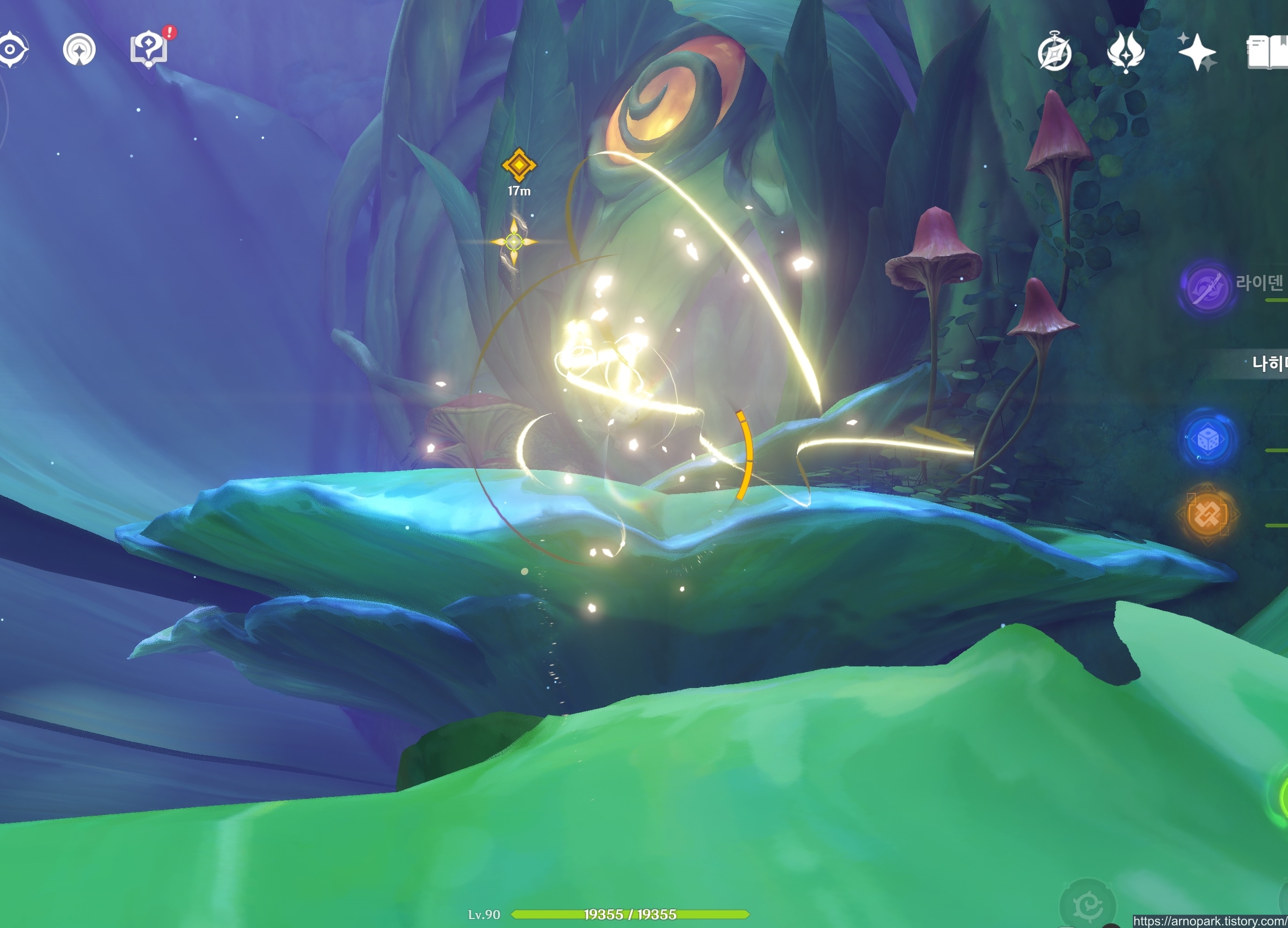 도전 버섯이 있는데, 도전을 시작하기 전에 사진의 네모 부분에 위치한 식물을 풀 원소 스킬로 때려줍니다.