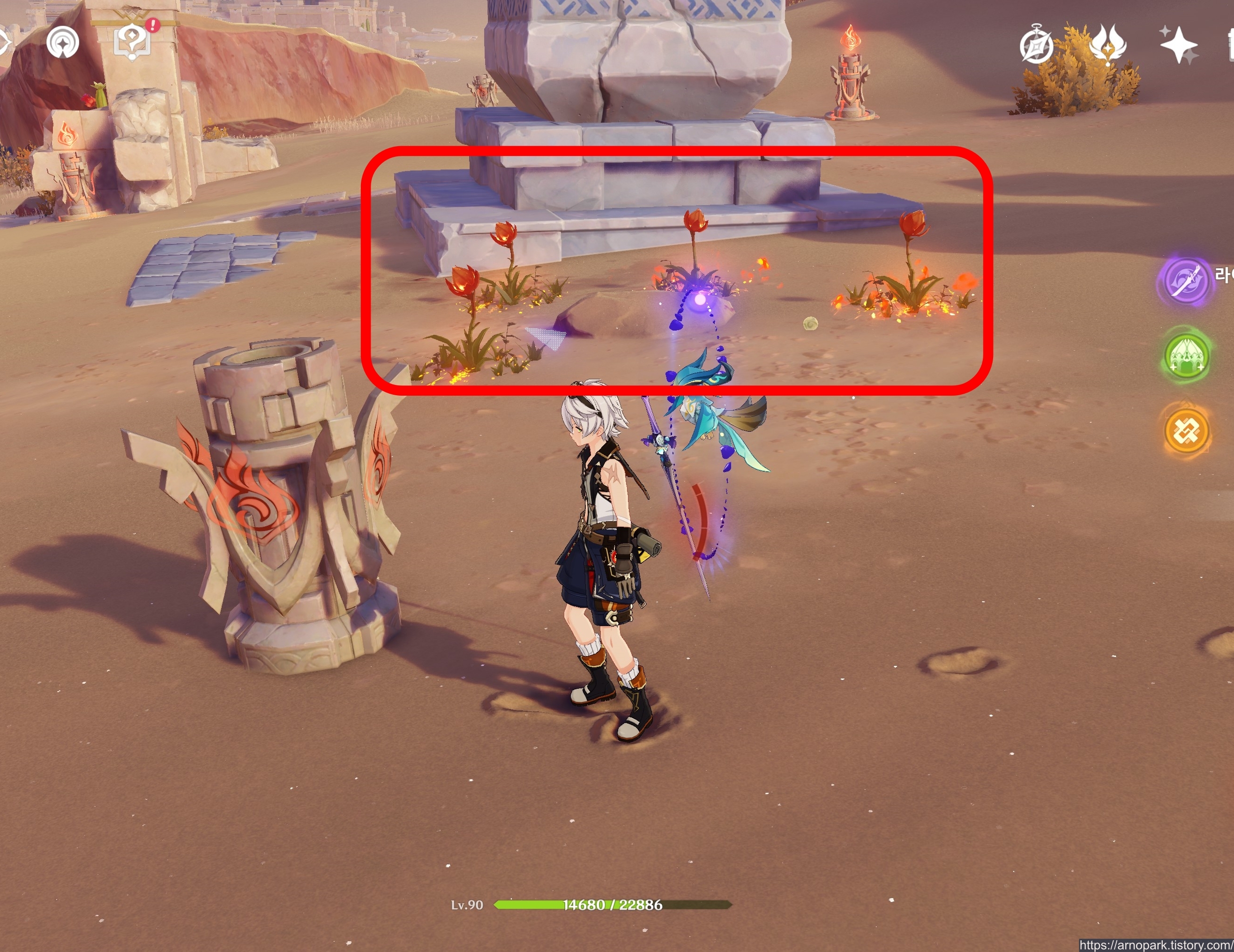 - 비경 제단 주위에 불꽃 원소 기둥이 5개가 있습니다.