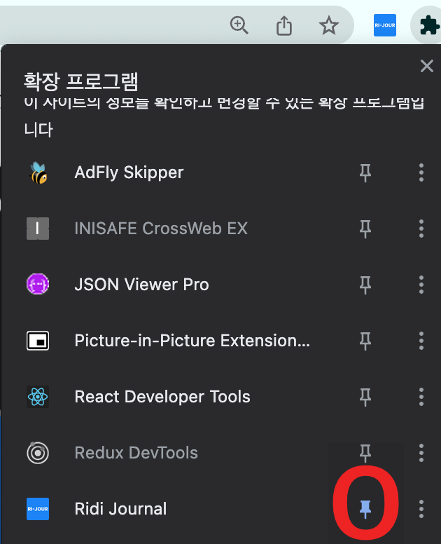 확장 프로그램 아이콘을 누른 후, Ridi Journal에 Pin을 활성화하면 됩니다.