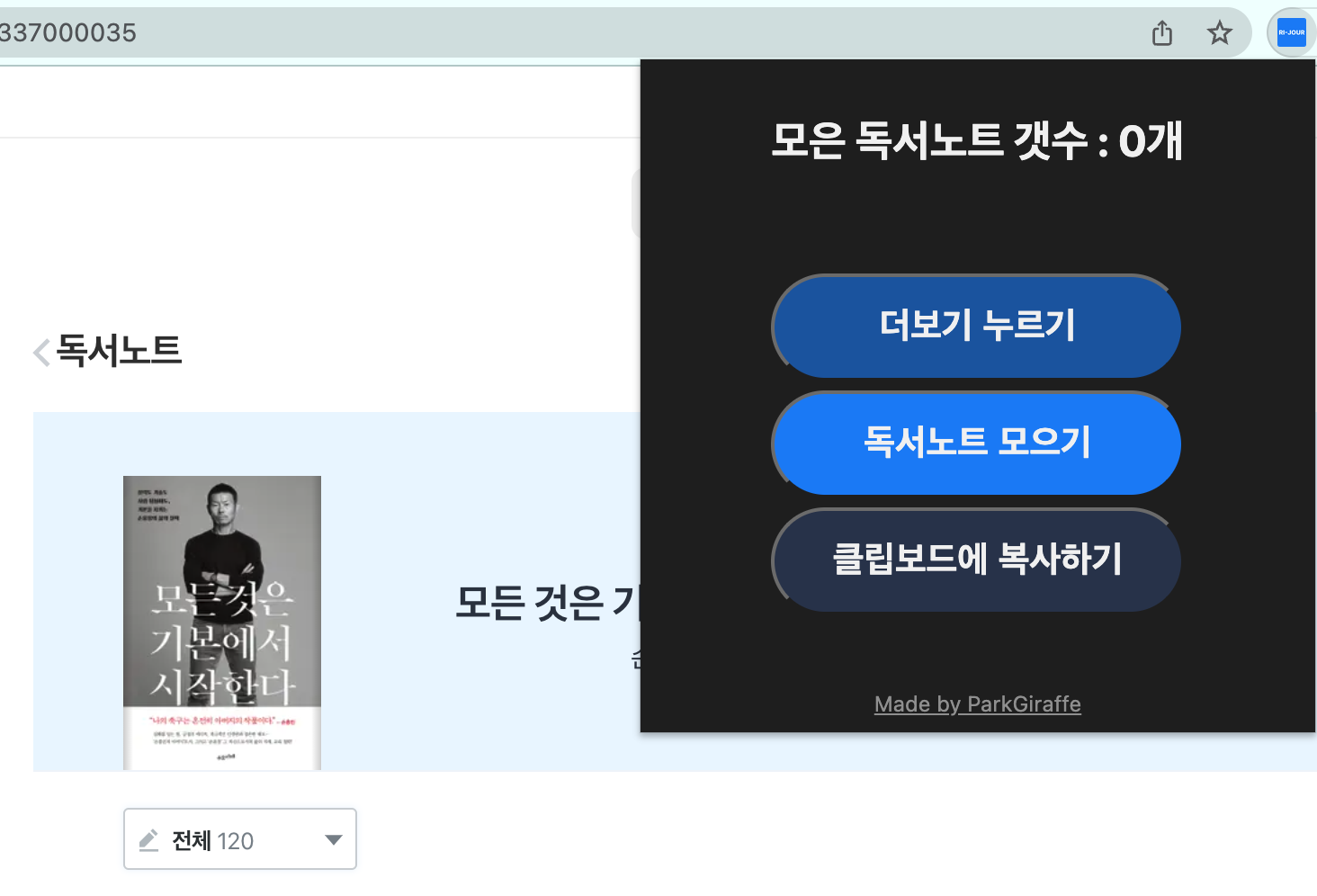 이때 '독서노트 모으기' 버튼을 누르면, 모든 글귀를 긁어옵니다.