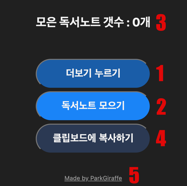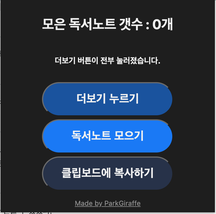 이 버튼은 '3초 간격'으로 독서노트 페이지의 '20개 더보기' 버튼을 누릅니다. 그러므로 차분한 마음을 가지고 실행과정을 기다려야 합니다.
