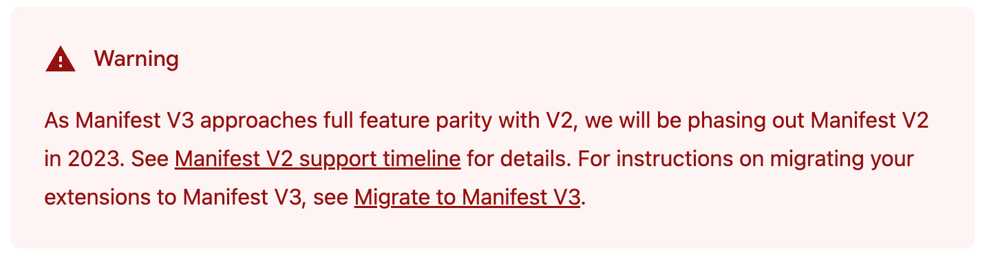 구글 크롬 익스텐션 공식 API 문서에 따르면, Manifest V2로 제작된 크롬 확장프로그램의 지원을 중단할 것임을 경고하고 있습니다. 따라서 Manifest V3로 크롬 확장프로그램을 제작해야 합니다.