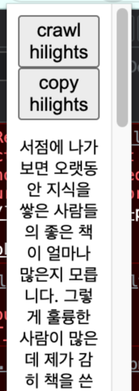 크롬 확장프로그램을 빌드한 후, 실제 리디북스 독서노트 페이지에 들어가서 팝업창의 버튼을 누르면,