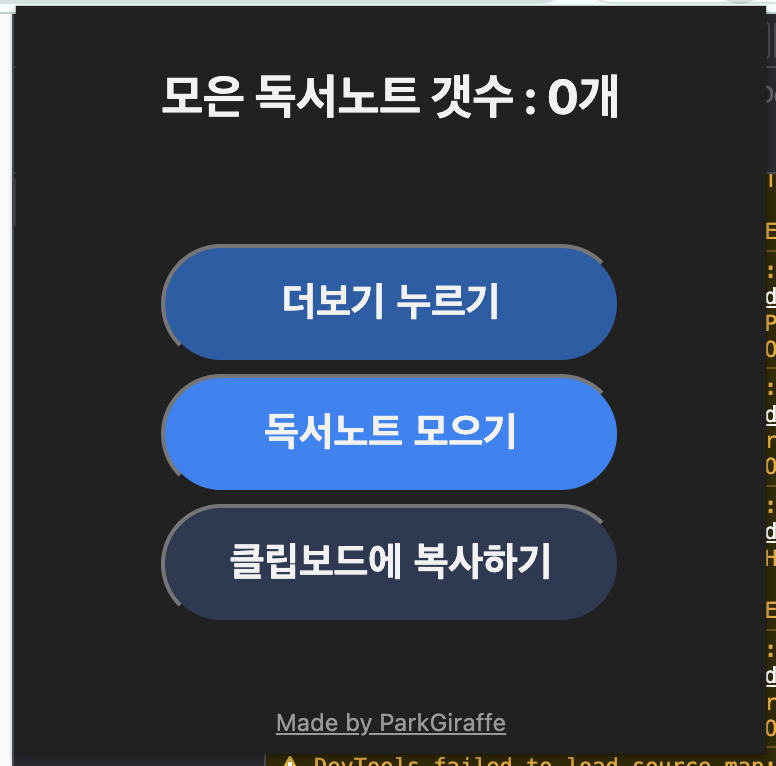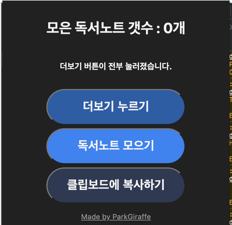 Popup에 버튼을 하나 추가한 후, 이 버튼을 누르면 리디 독서노트의 더보기 버튼을 누르라고 Chrome API로 메시지를 보내는 핸들러 함수를 만듭니다.