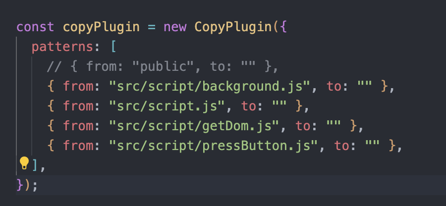 pressButton.js가 build 폴더에 포함될 수 있도록, webpack 설정파일에 pressButton.js의 경로를 추가합니다.