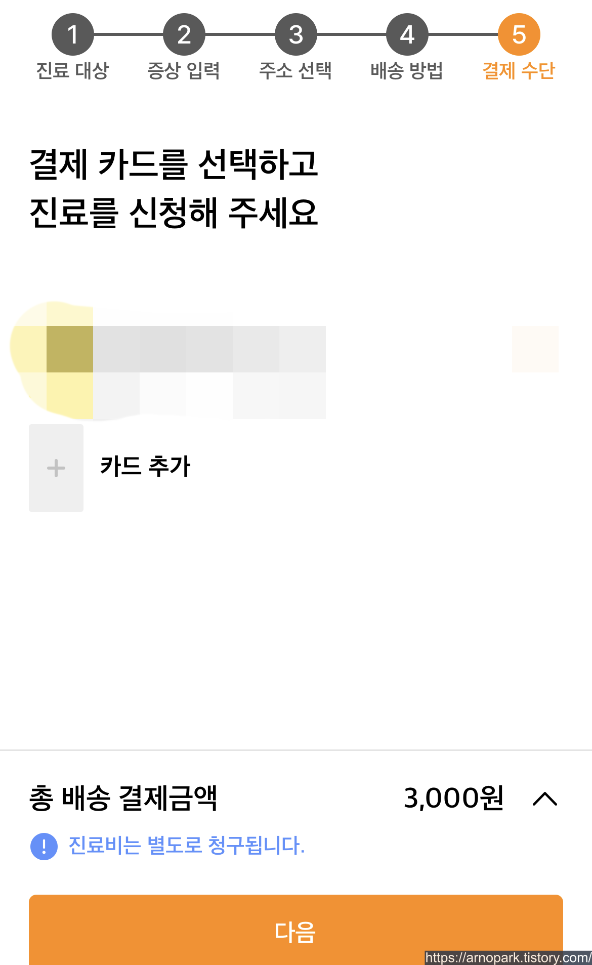 진료 신청을 하면 증상에 대해 간단하게 입력하고, 결제 방법을 선택합니다.