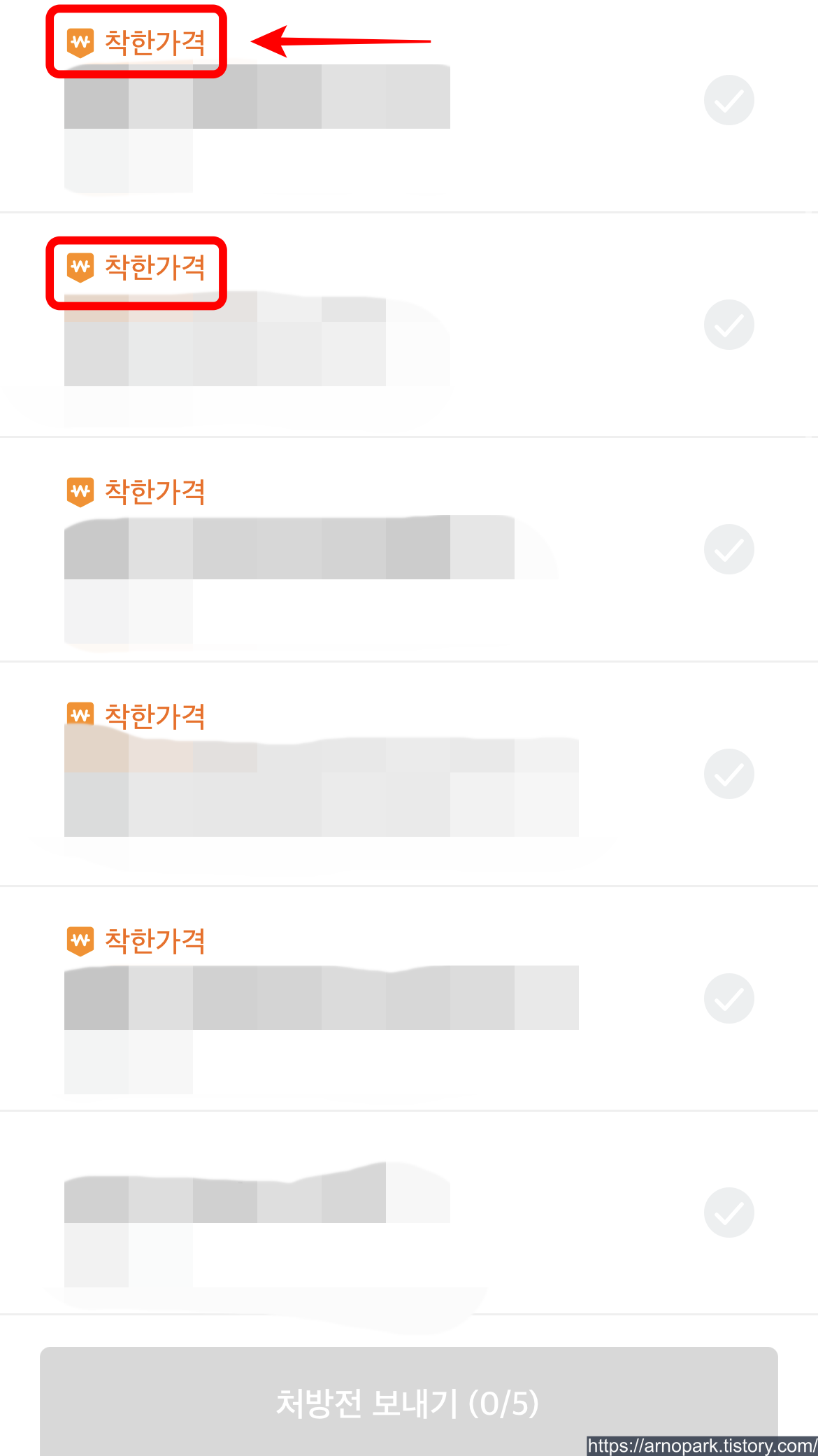 처방전은 한 번에 5개의 약국에 보낼 수 있기에 착한가격 약국을 전부 선택해서 보내줍시다.