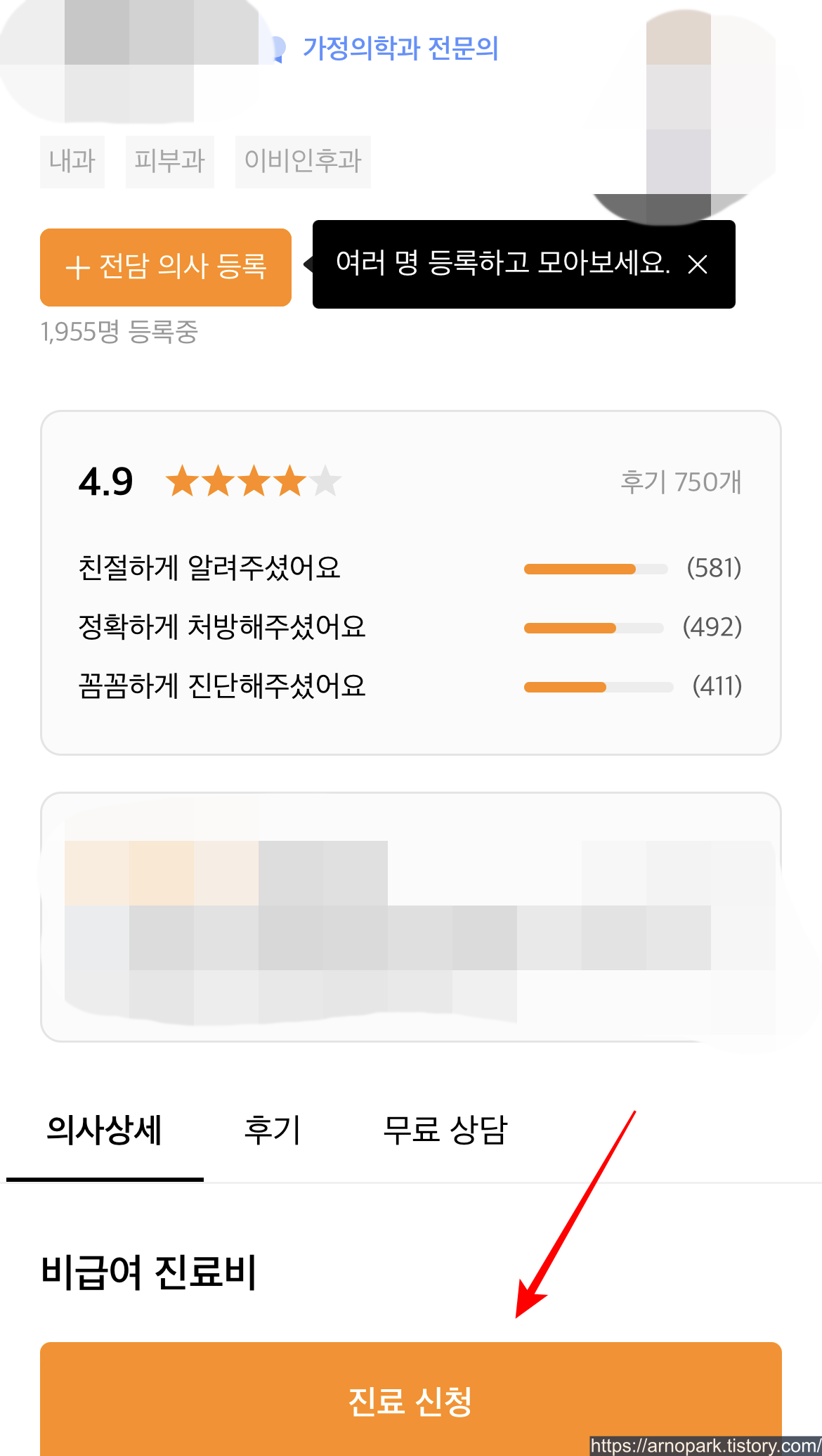 후기가 괜찮은 의사를 선택한 후, 진료 신청을 누릅니다.