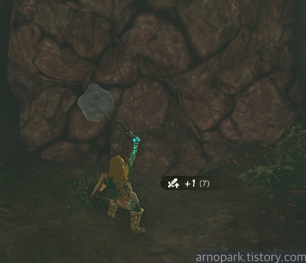 스크래빌드를 이용해서 앞에 있는 바위를 무기와 합체 시킨 뒤,