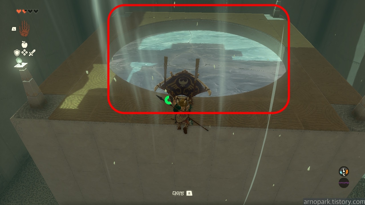 3등분된 구멍 안으로 들어간 후, 아래의 얼음을 다이빙으로 깨부셔야 합니다.