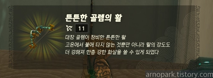 유적 골렘을 잡고 상자를 엽니다. 상자 안에는 튼튼한 골렘의 활이 있습니다.