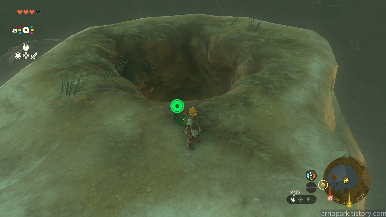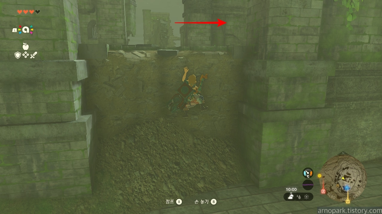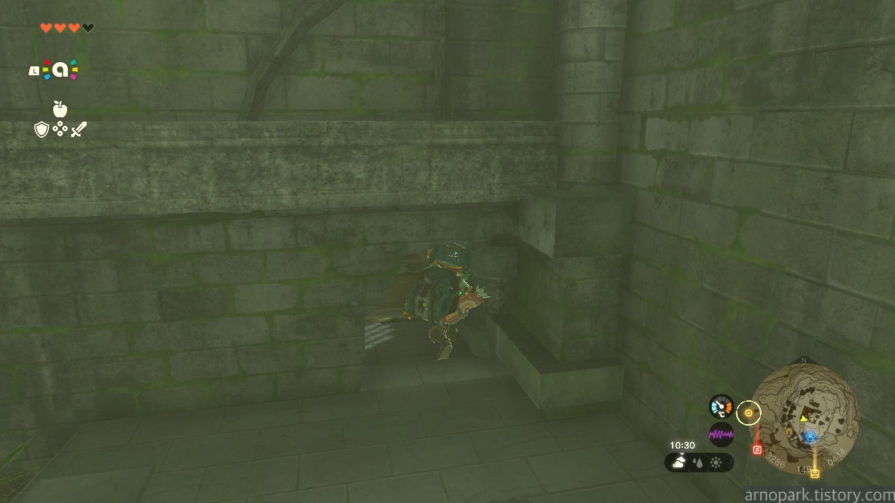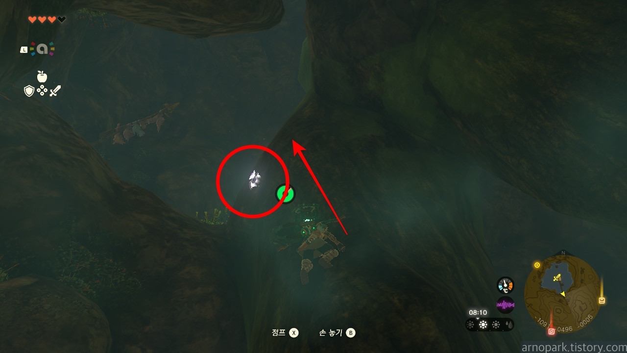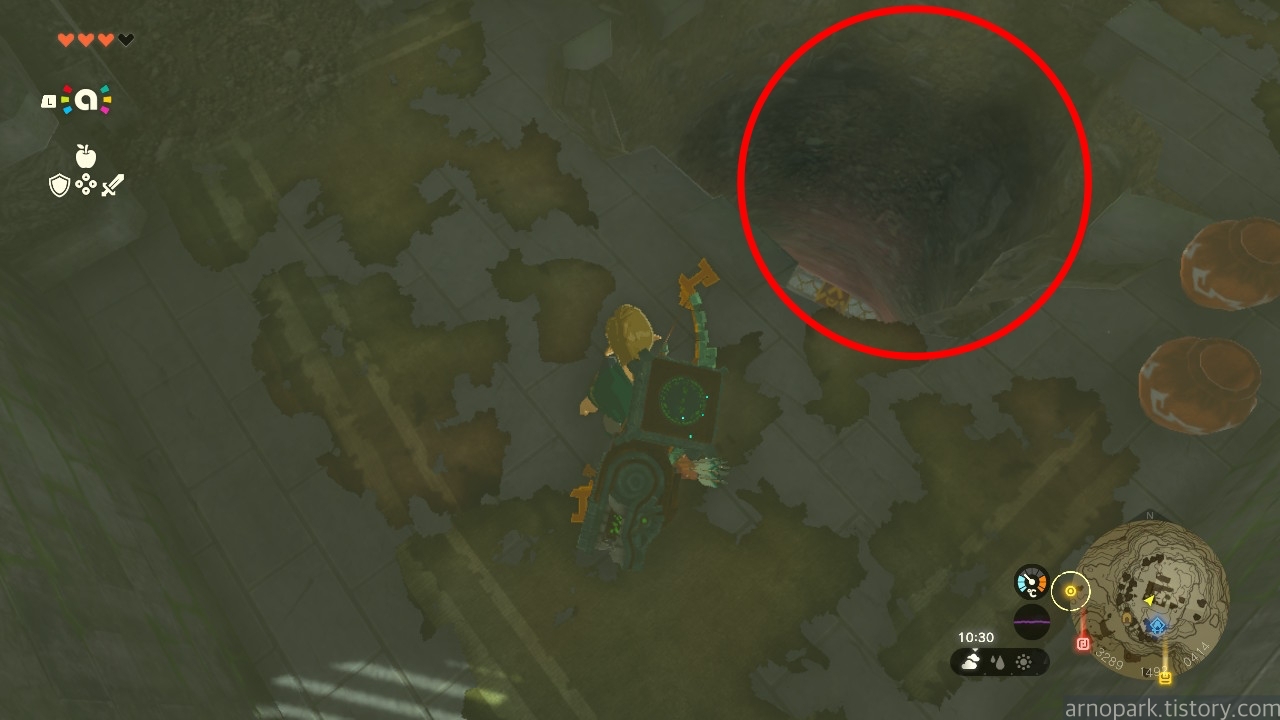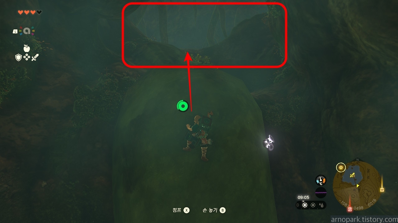 구멍 안으로 몸을 숙여서 들어갑니다. (몸을 숙이는 방법 : L스틱을 누르세요.)
