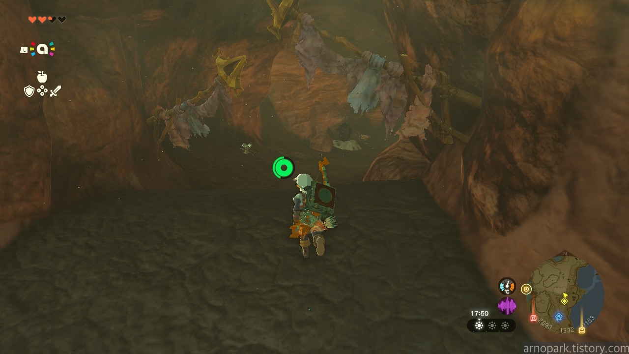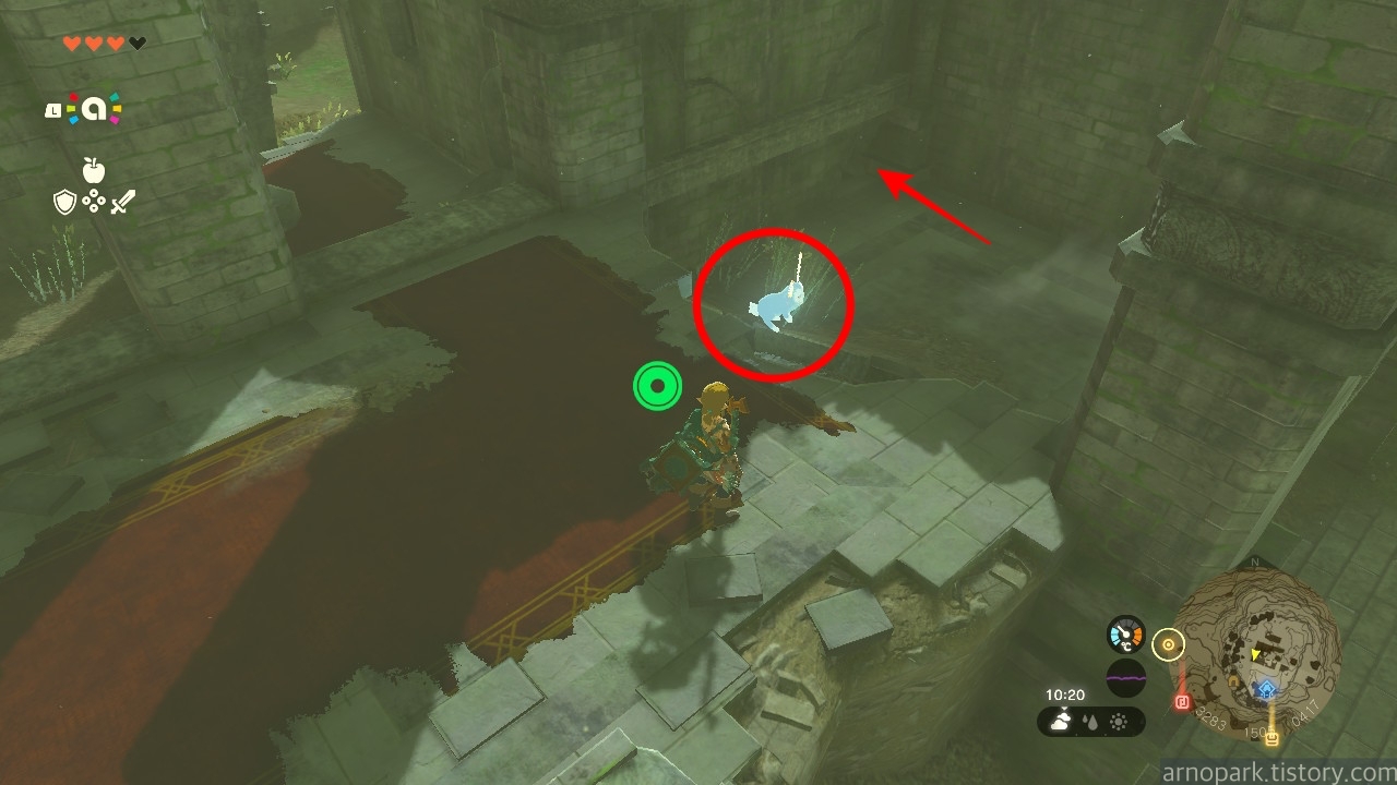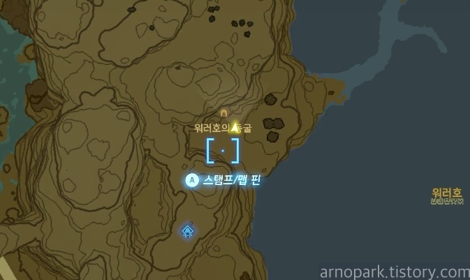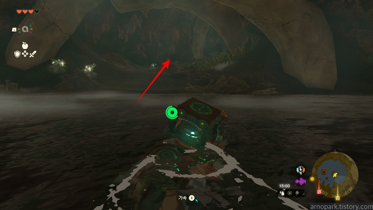 해골 연못의 동굴 밑에는 물이 있습니다. 물에 착지하면 화살표 방향으로 수영을 한 후, 동굴 내부로 쭉 진입합니다.
