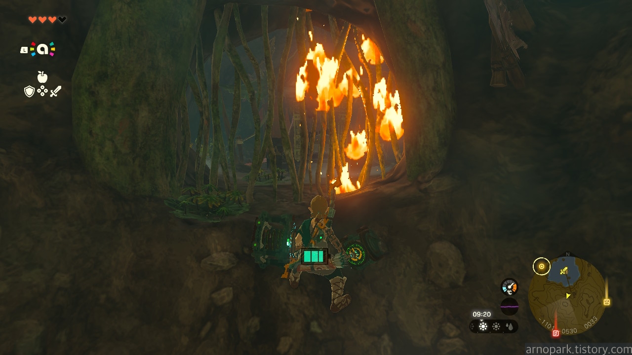 덩굴을 불로 태운 후, 안으로 진입합니다.