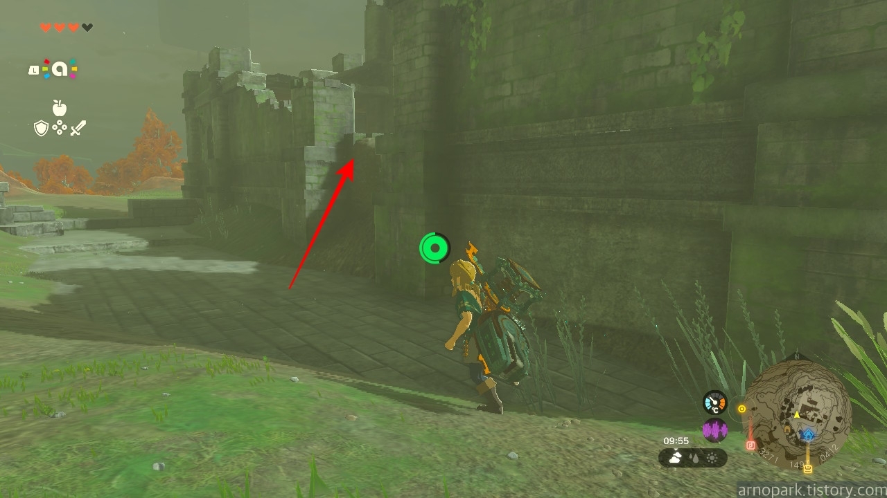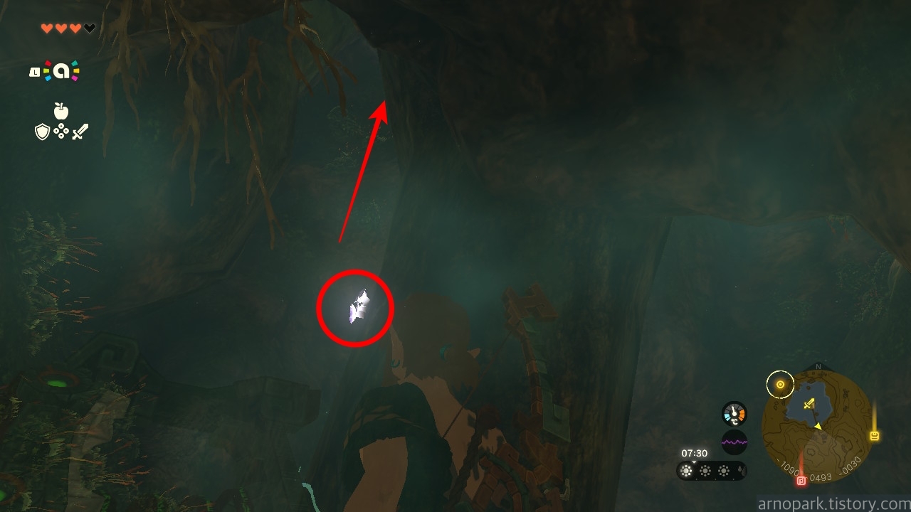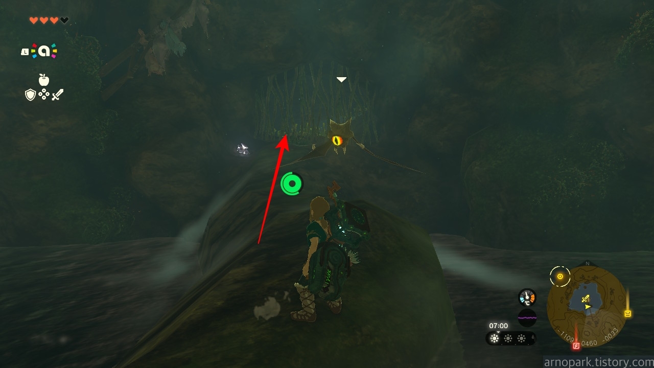 길 안내 요정을 따라 우측을 보면, 사진의 화살표 방향에 있는 구멍을 발견할 수 있습니다.