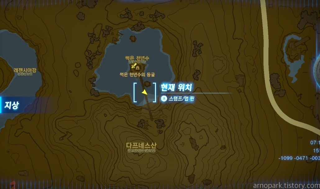 다프네스 산 북쪽에 호수와 다리가 있습니다. (검 마커로 표시한 부분)