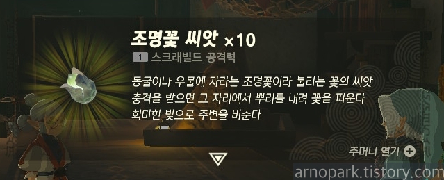 미션을 받으면, 조슈아로부터 조명꽃 씨앗과 나무 화살을 받을 수 있습니다.