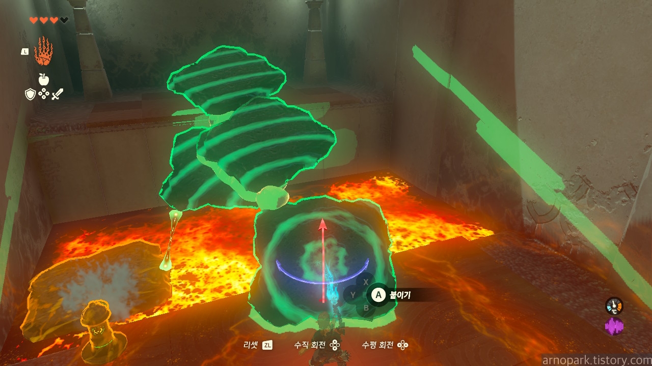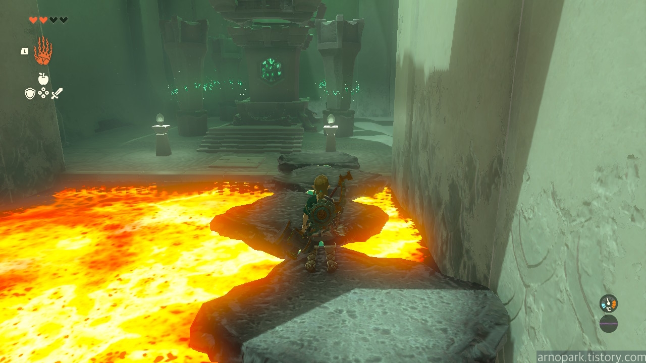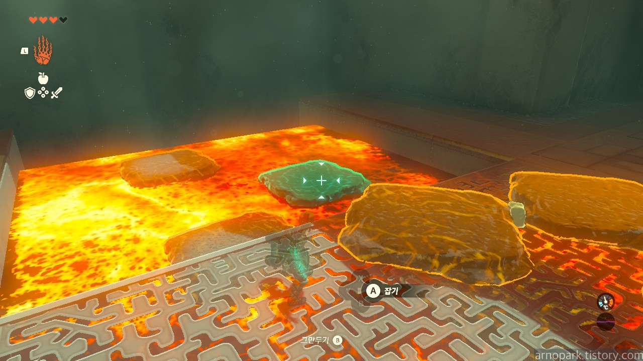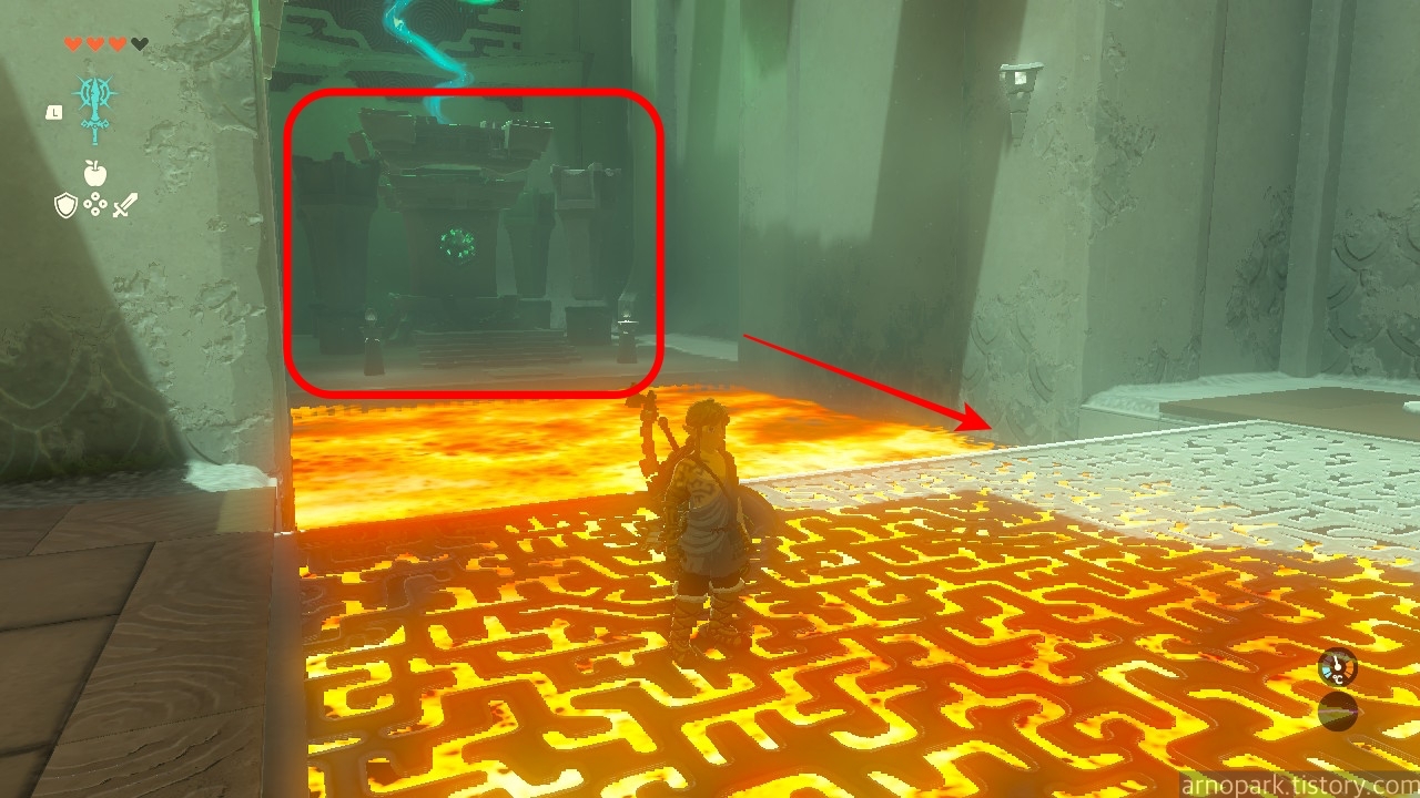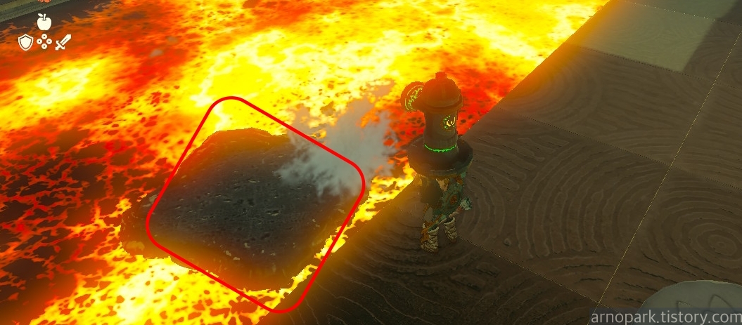 건너편에 축복의 빛을 받을 수 있는 끝 구역이 있고, 용암은 사진의 화살표 방향으로 흐릅니다.