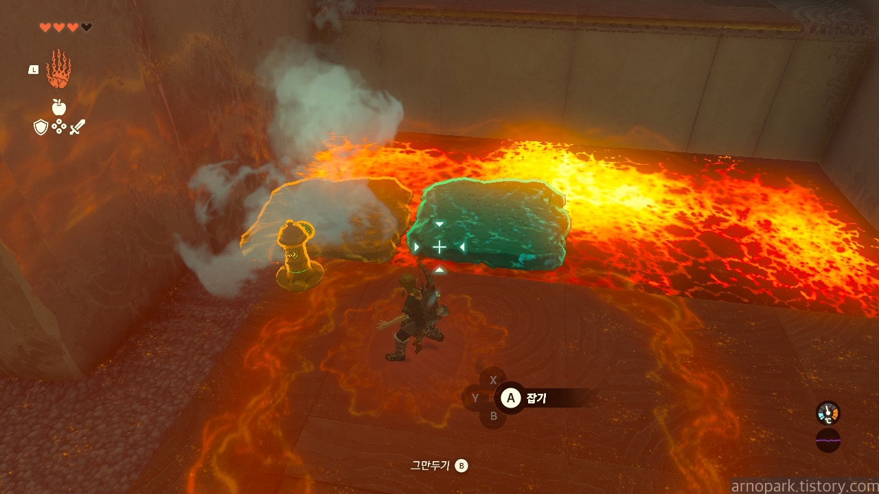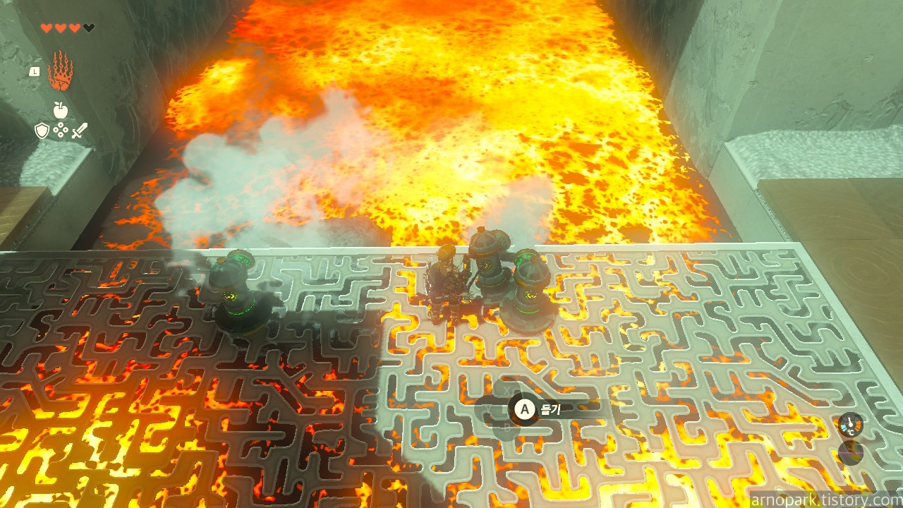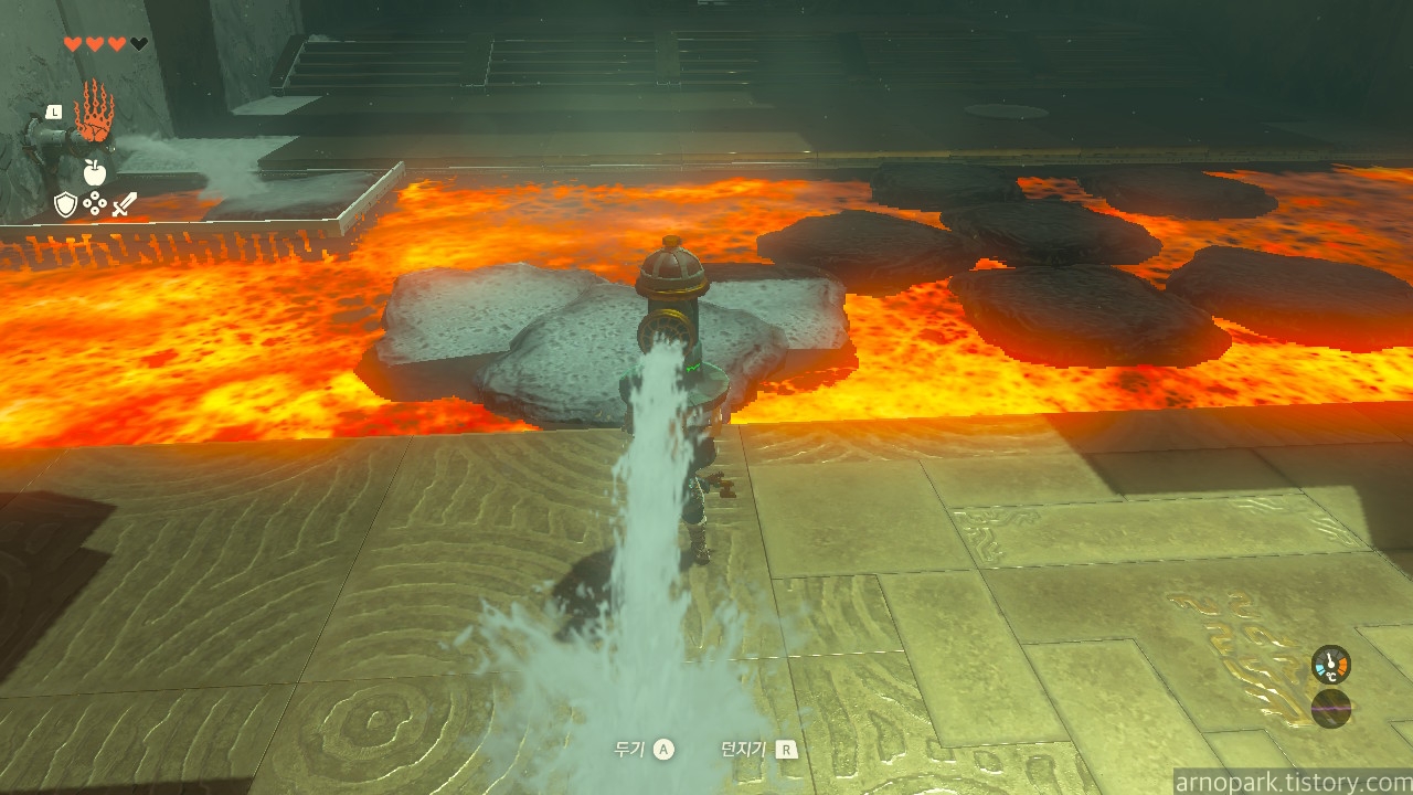 소화전을 들고, 현무암으로 길을 만들면서, 용암을 건너가면 됩니다.