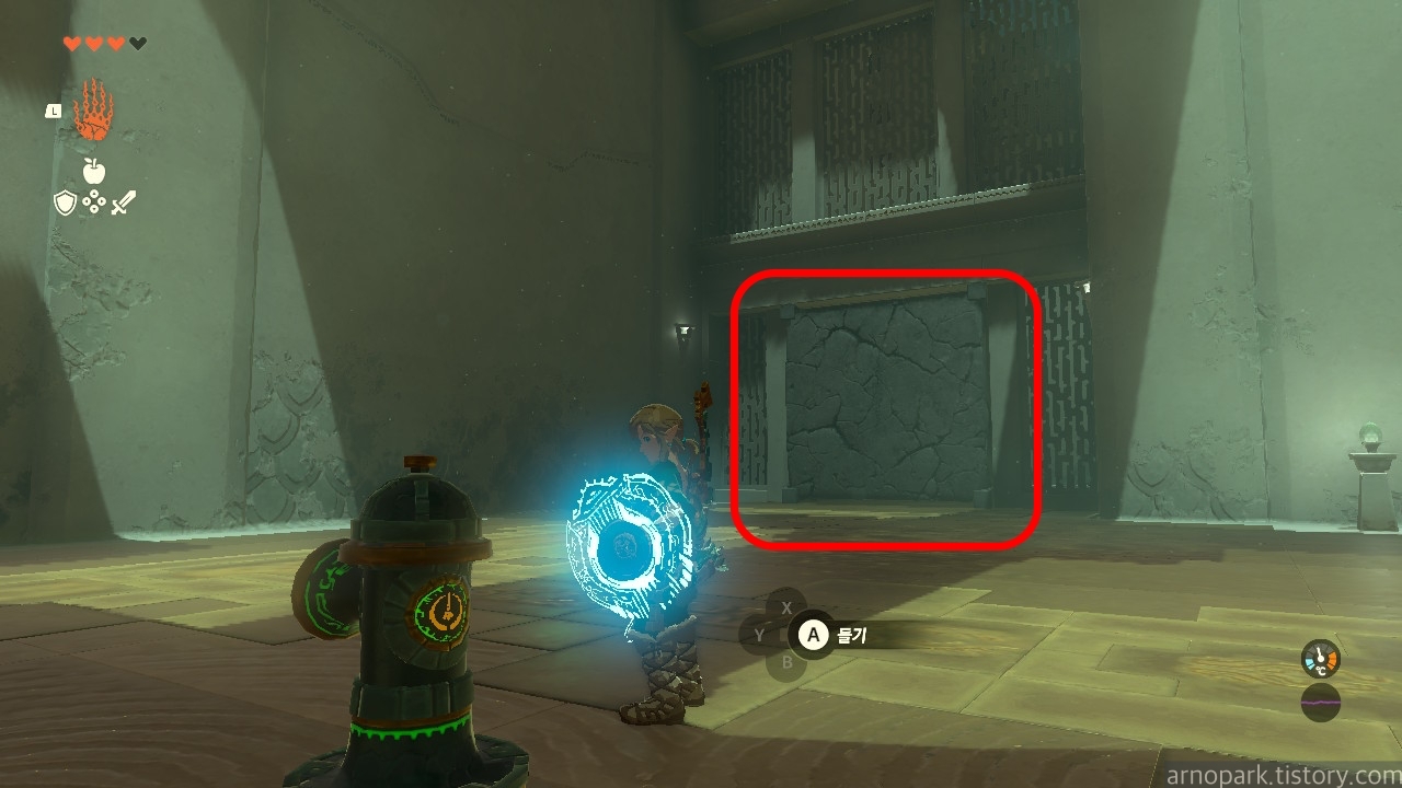 왼쪽은 상자, 오른쪽은 부실 수 있는 돌로 막힌 입구 입니다.