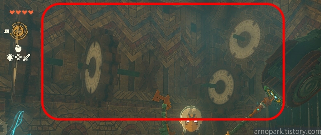 톱니 장치 주변에 있는 유적 잔해를 주운 후, 톱니 장치와 연결합니다.