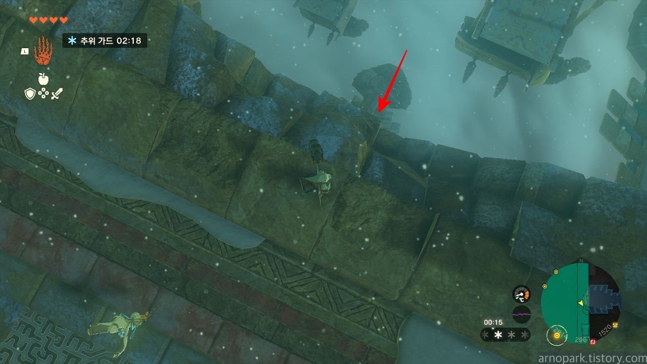 고드름으로 막혀 있지만, 앞에 살짝 남아있는 부분으로 착지할 수 있습니다.